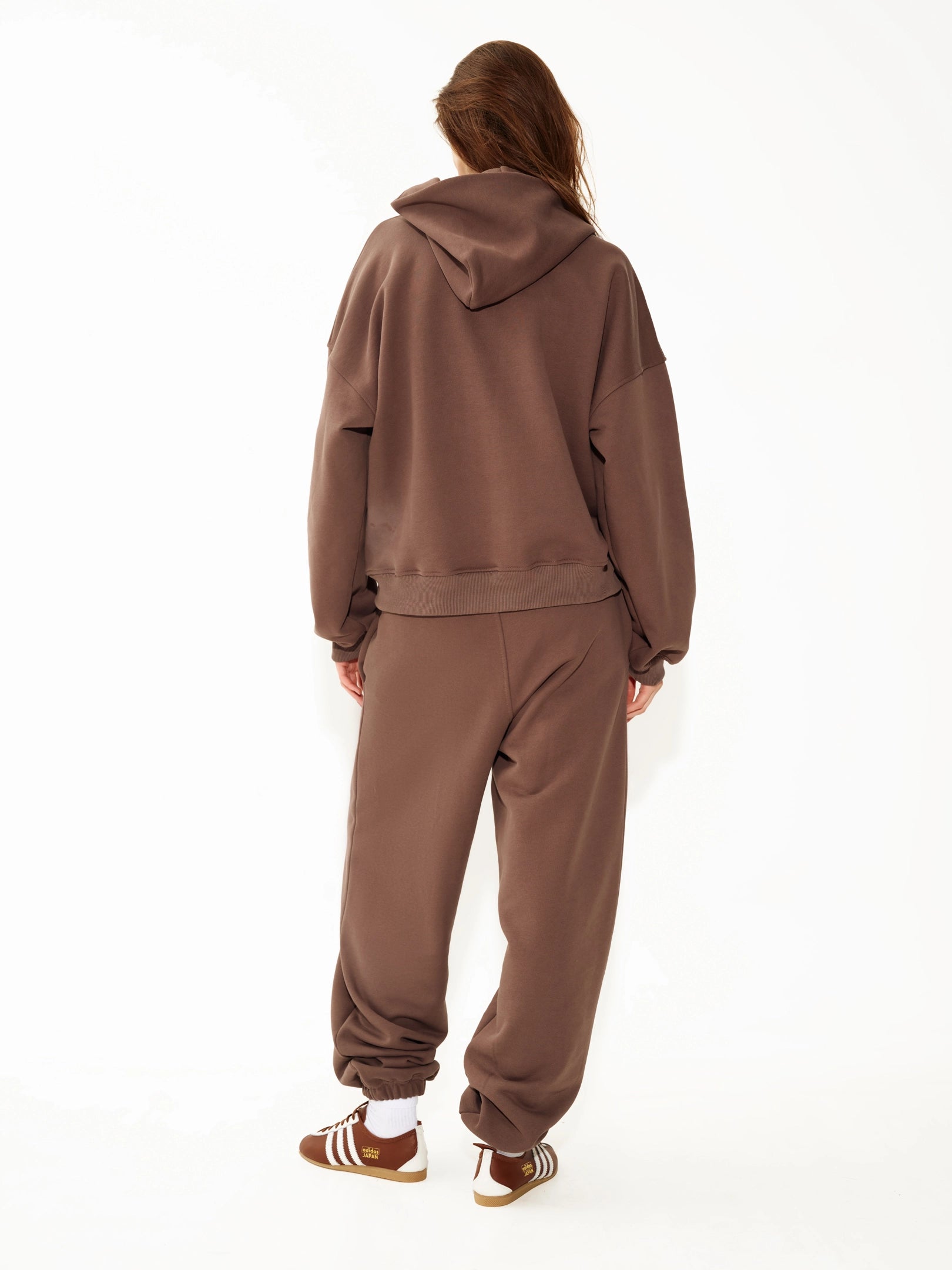 The oversized hoodie features a lowered shoulder line, giving it a relaxed silhouette. Its volumetric hood adds functionality, while the cuffs maintain the shape of the garment.