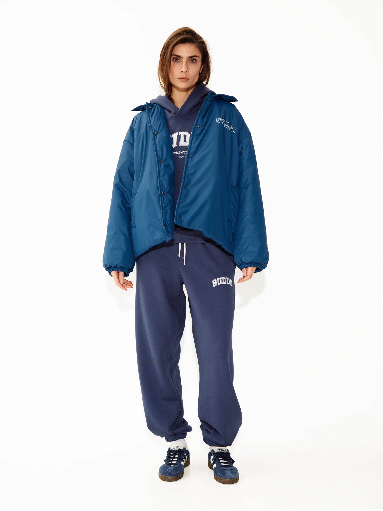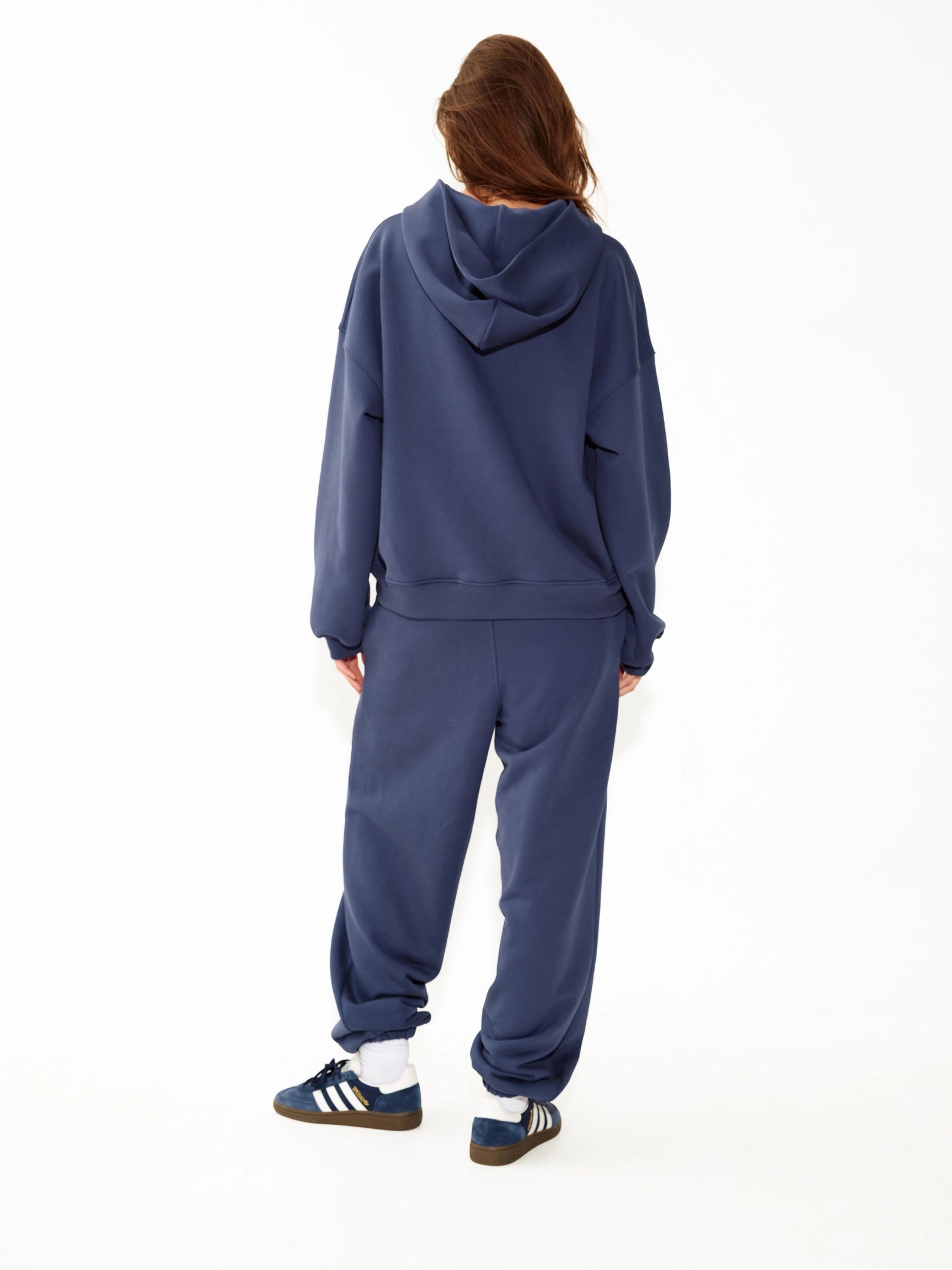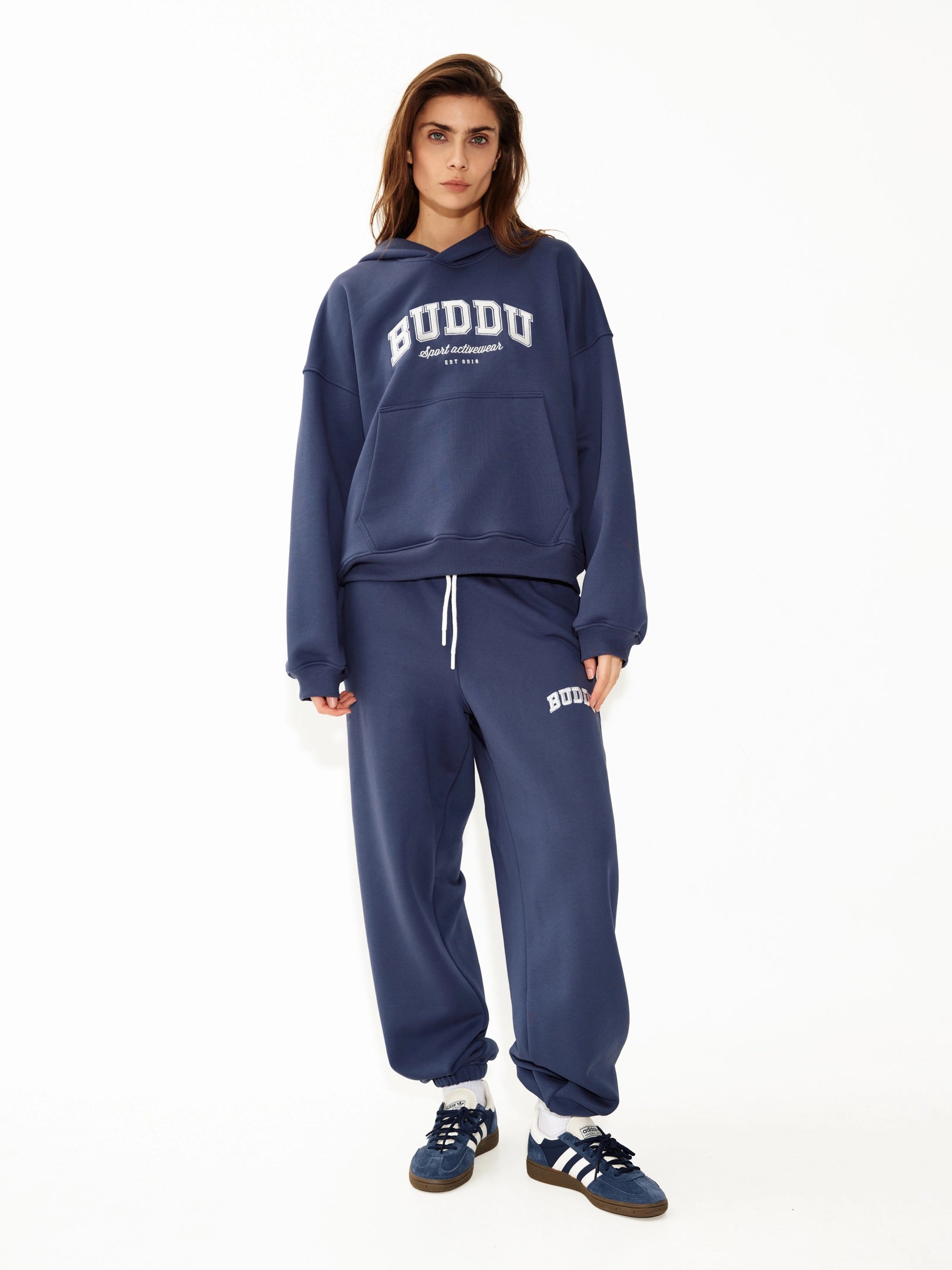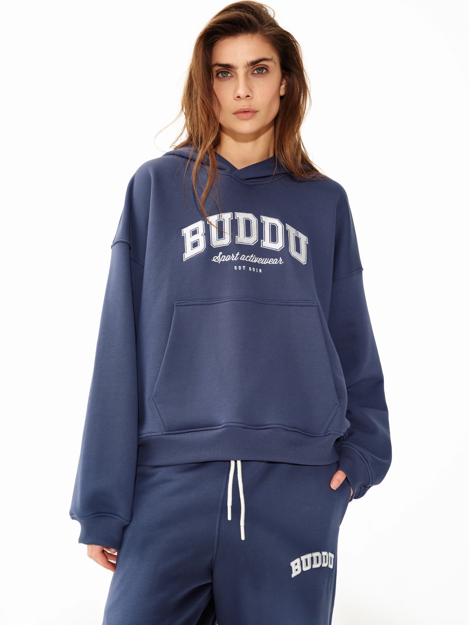 The oversized hoodie features a lowered shoulder line, giving it a relaxed silhouette. Its volumetric hood adds functionality, while the cuffs maintain the shape of the garment.