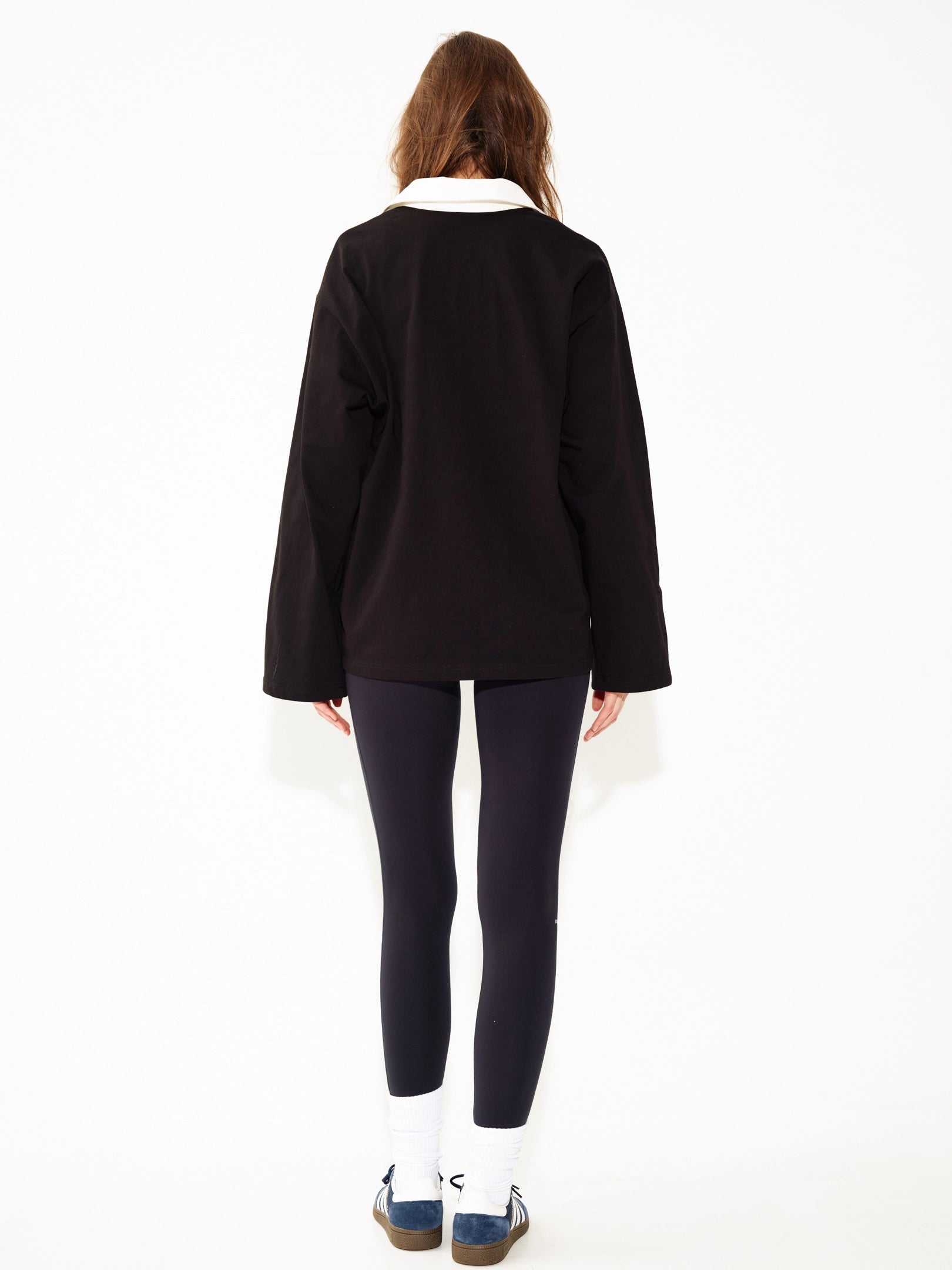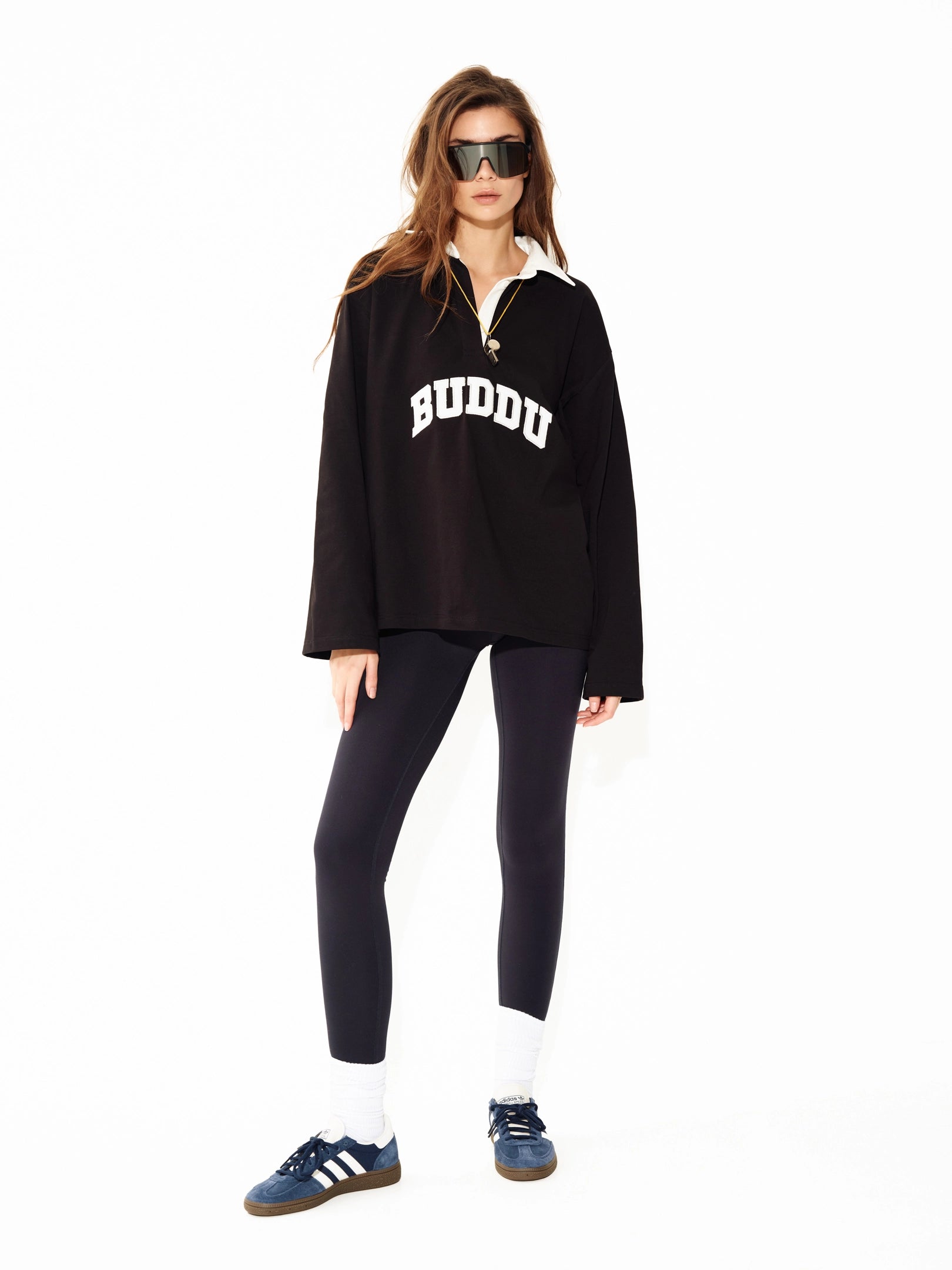 This is a polo-style long-sleeve shirt featuring a classic turn-down collar and a loose fit. The accent collar adds a touch of understated elegance, while the prominent logo on the chest highlights its sporty aesthetic. Made from 100% cotton, this versatile design pairs effortlessly with joggers, leggings, or jeans, creating a stylish and relaxed look.