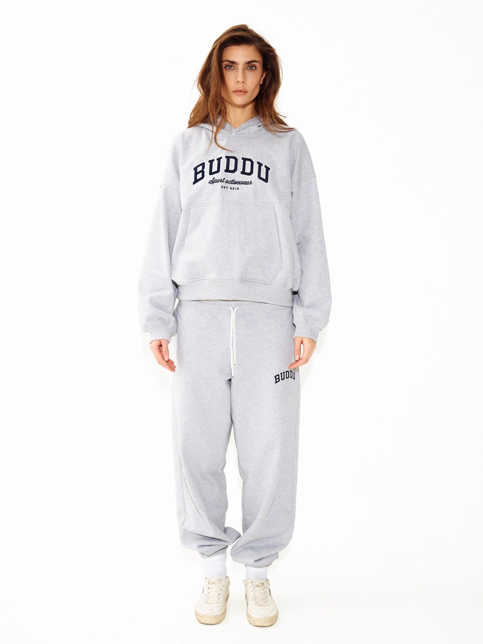 The oversized hoodie features a lowered shoulder line, giving it a relaxed silhouette. Its volumetric hood adds functionality, while the cuffs maintain the shape of the garment.