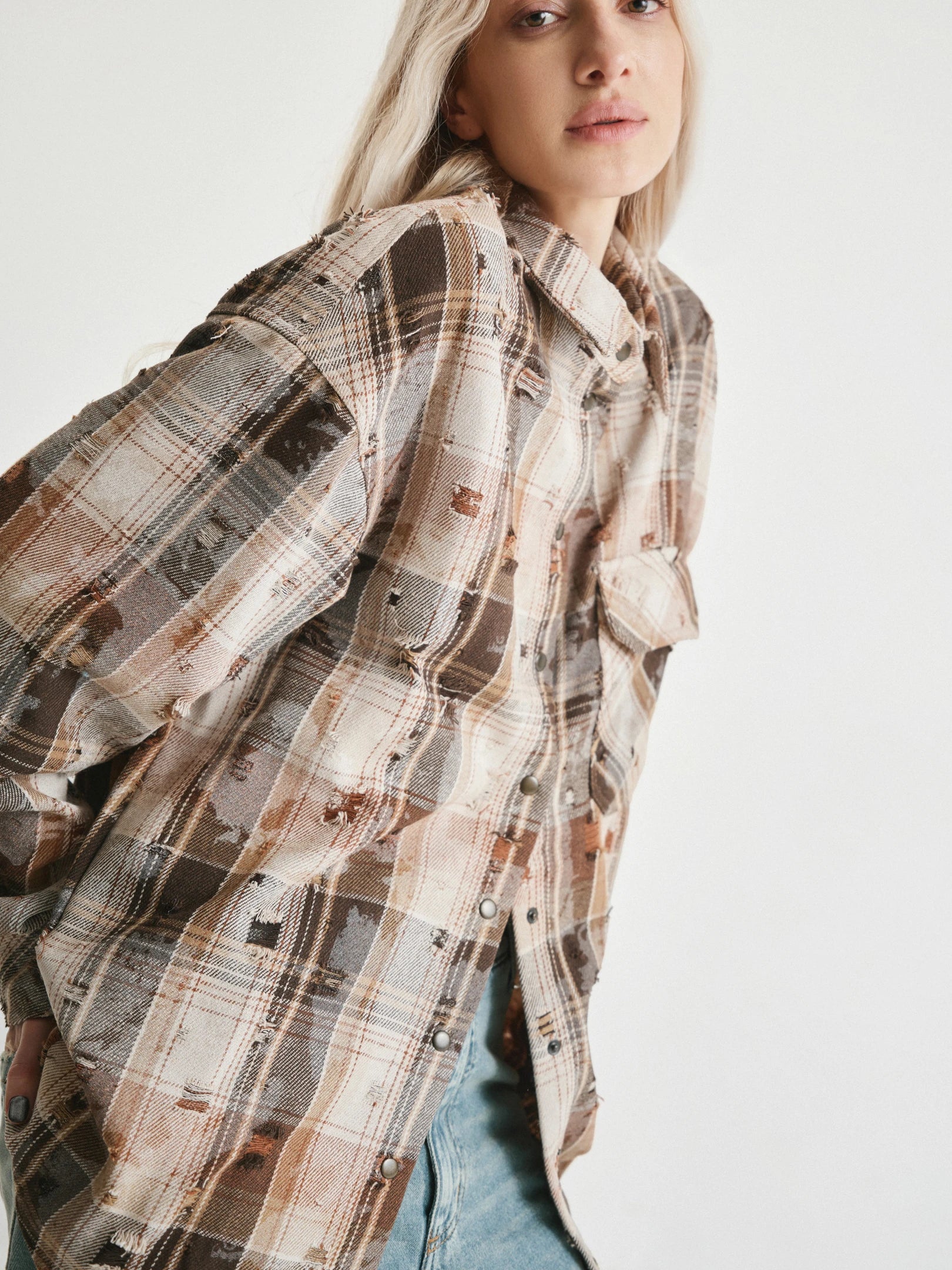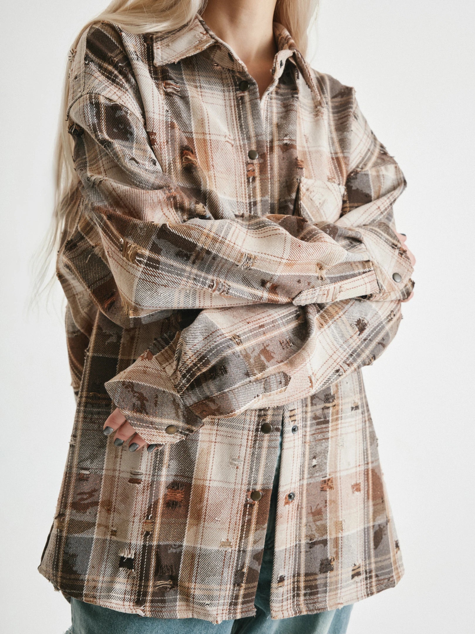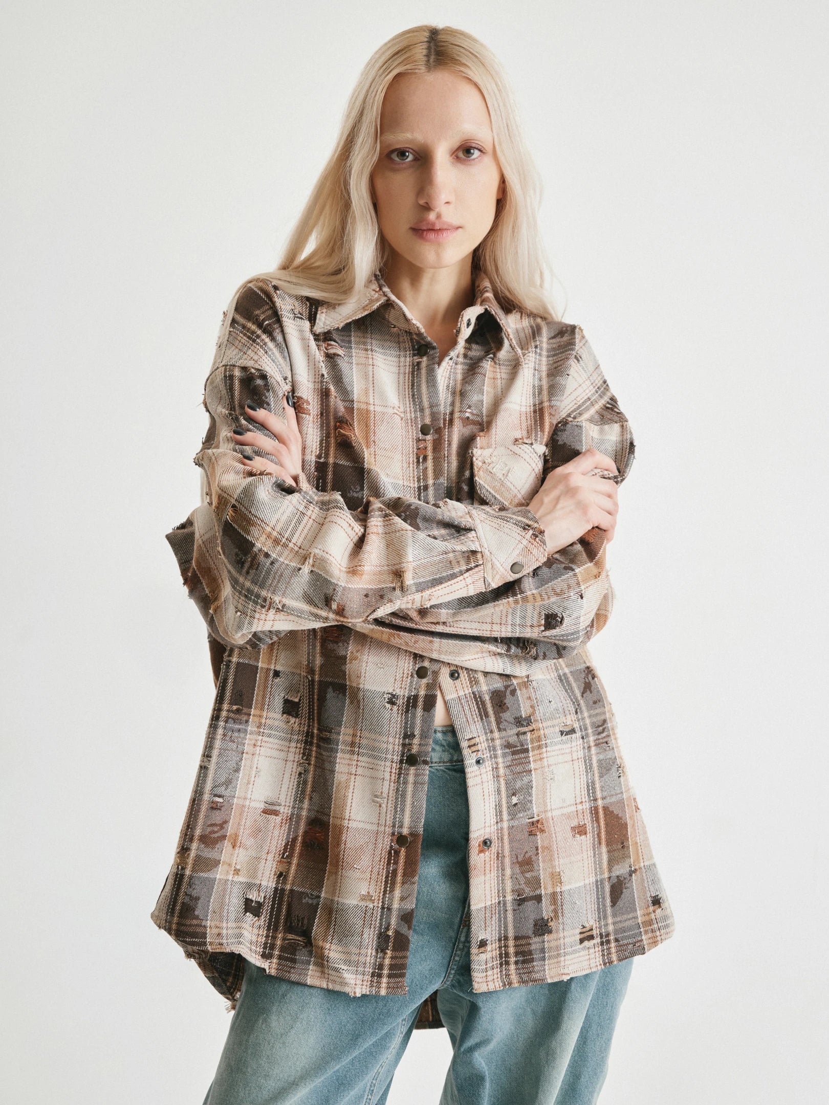 Oversized shirt featuring front pockets and decorative cuts throughout the fabric.