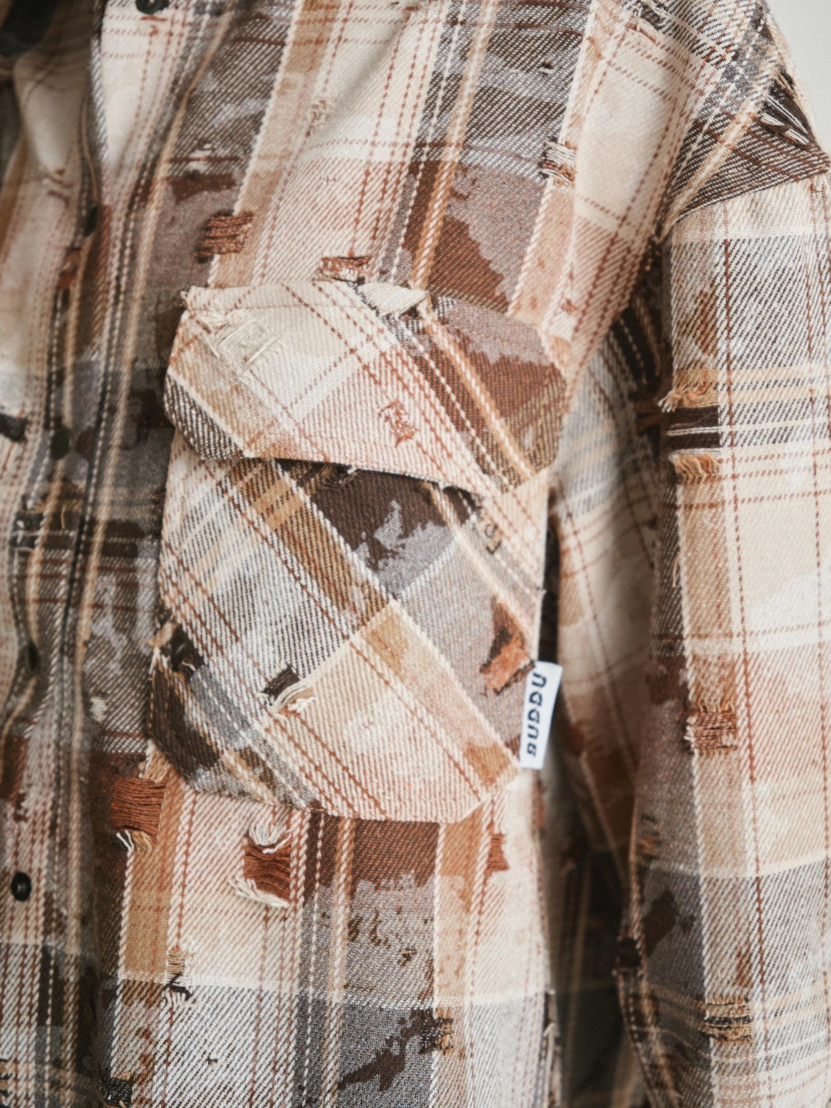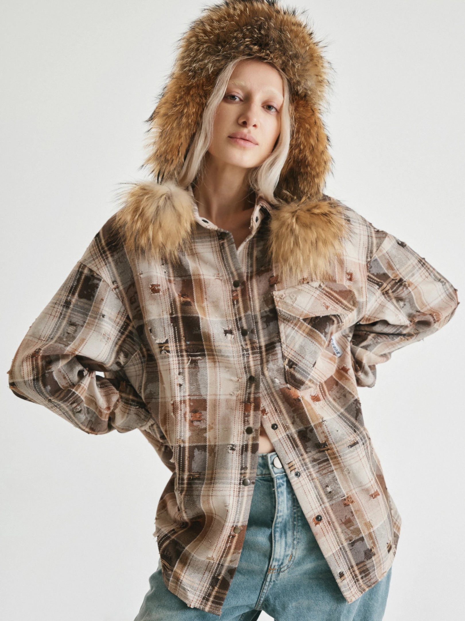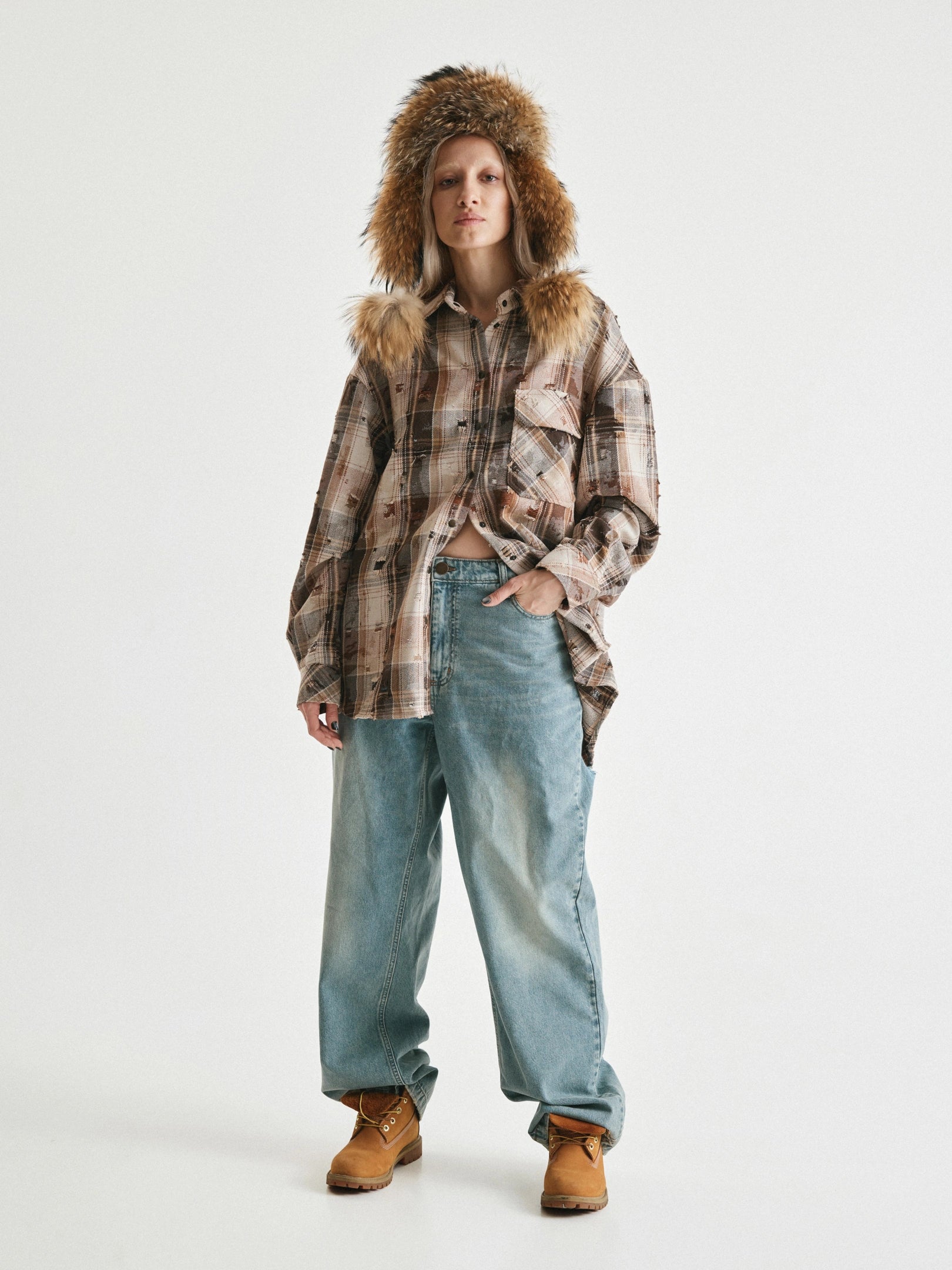 Oversized shirt featuring front pockets and decorative cuts throughout the fabric.