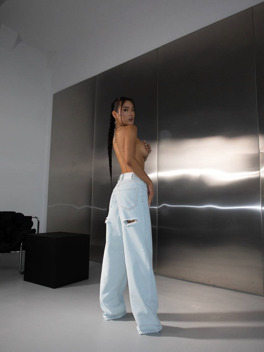 Straight cut jeans with a medium fit, made from 100% cotton. The model features decorative cuts beneath the back pockets.