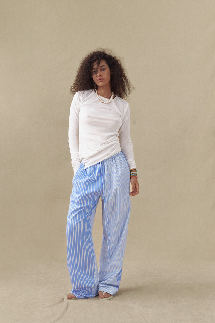 These striped pyjama-style trousers are crafted from 100% natural cotton. With their loose fit and elastic waistband, they are perfect for lounging at home or casual outings. A distinctive feature is the asymmetrical color of the legs: one leg is light blue while the other is dark blue, adding a unique touch to the design. The classic striped pattern makes it easy to mix and match these pants with various wardrobe pieces.