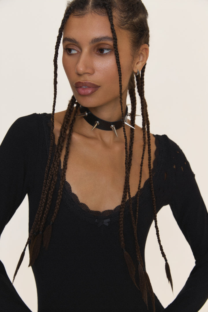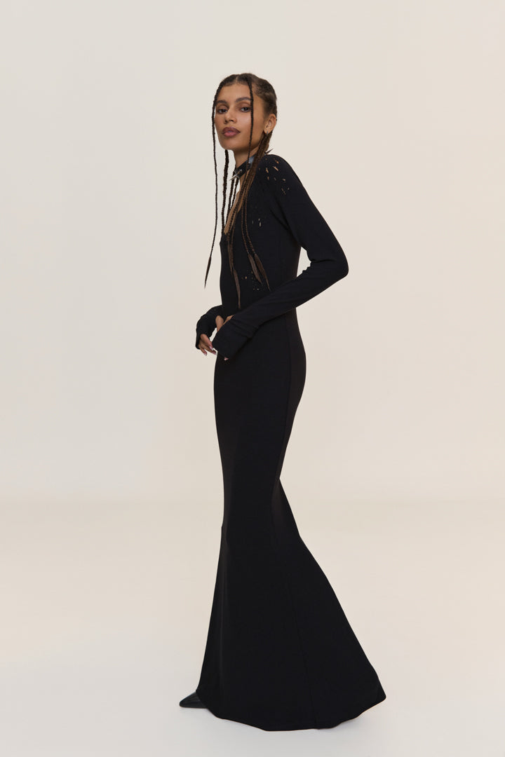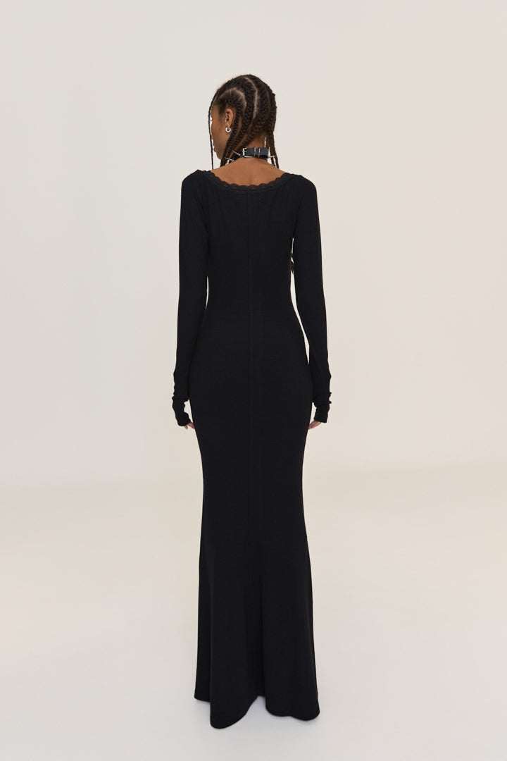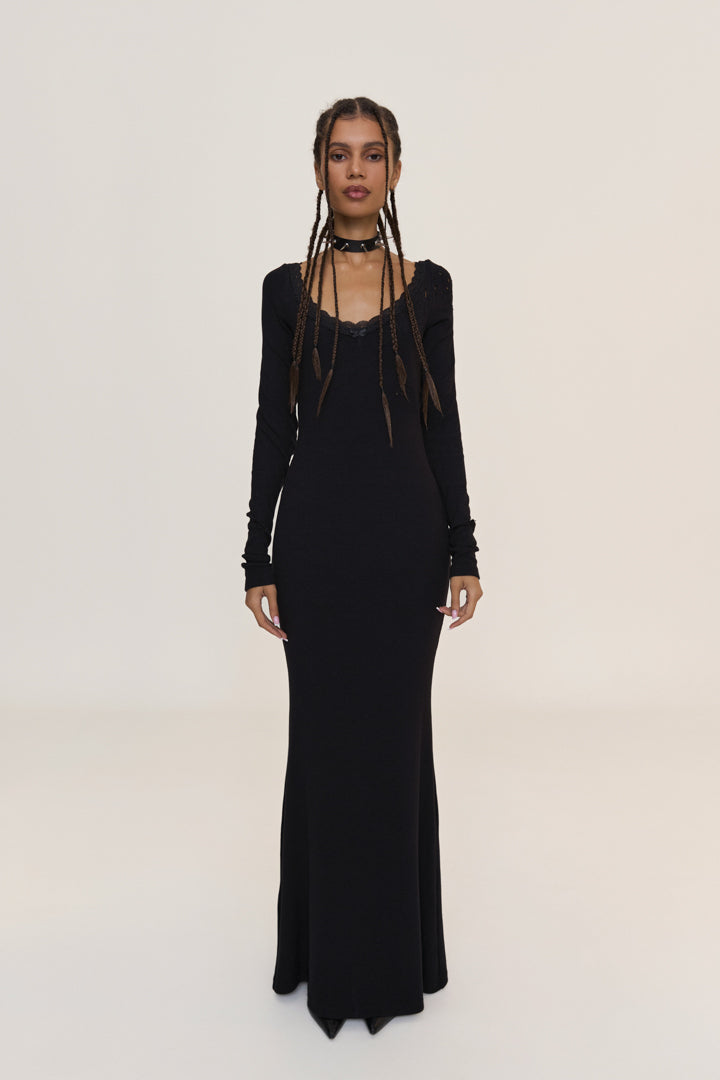This elegant fitted silhouette maxi dress features a beautiful V-neckline adorned with delicate lace, which highlights the neckline. The long sleeves add a touch of sophistication, while the figure-hugging design gently flares out at the bottom, allowing for ease of movement when walking. Made from a blend of viscose and natural cotton, the material ensures a soft and comfortable feel against the skin, perfect for all-day wear. The decorative lace detailing adds a unique charm to the dress.