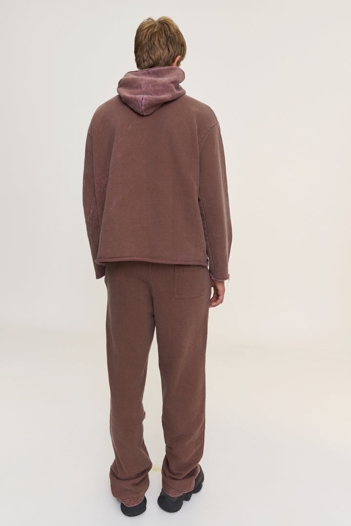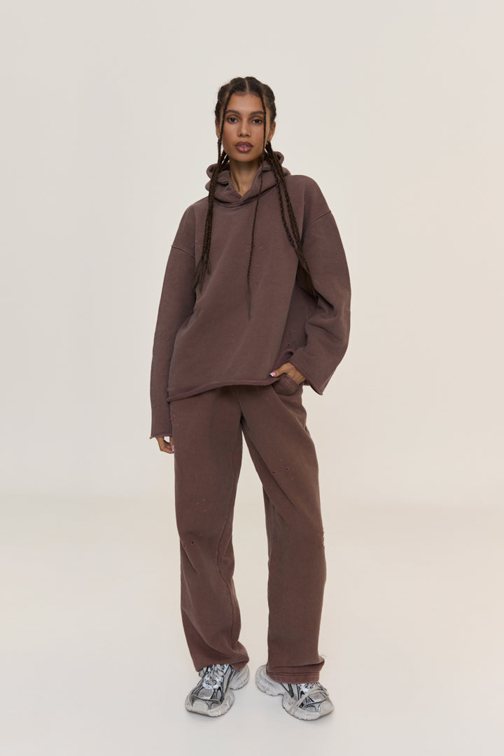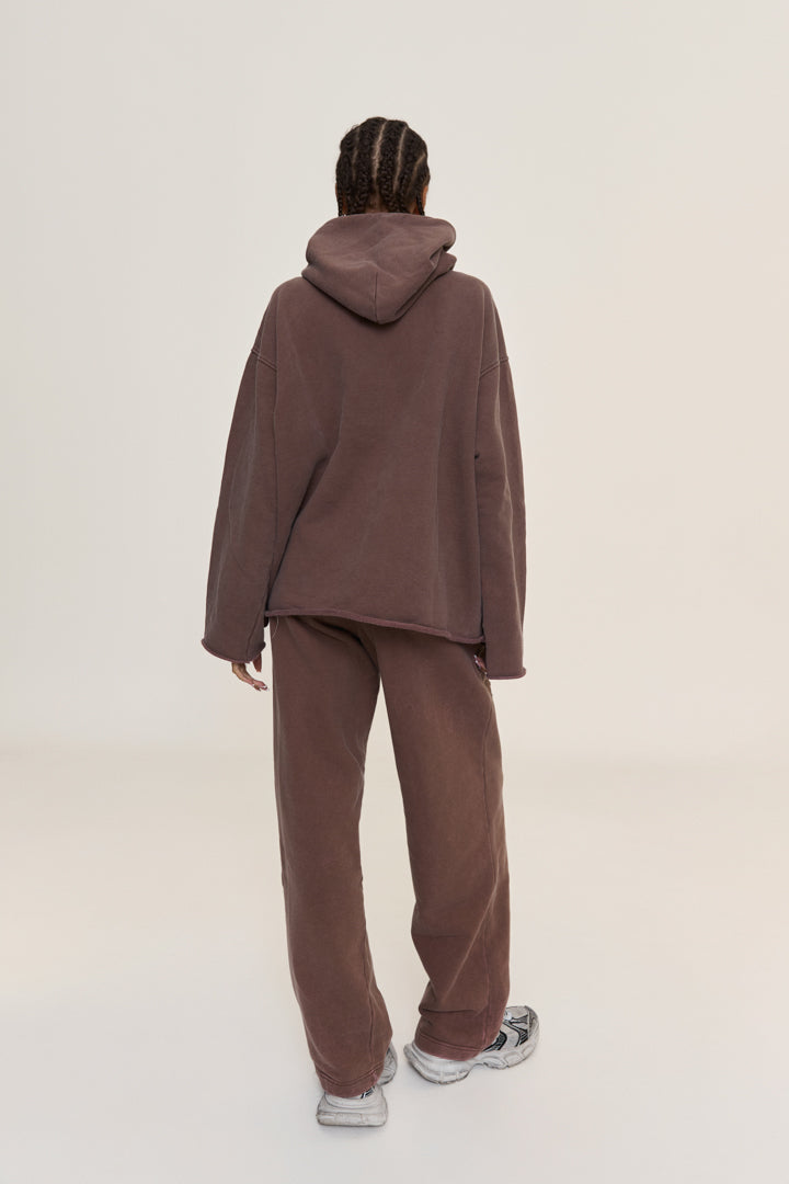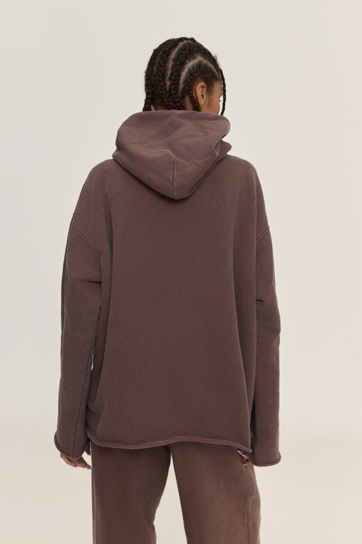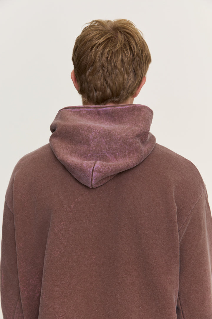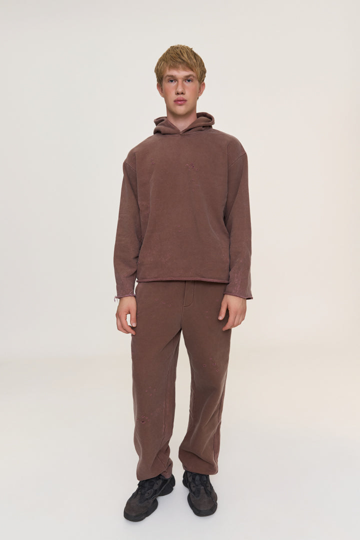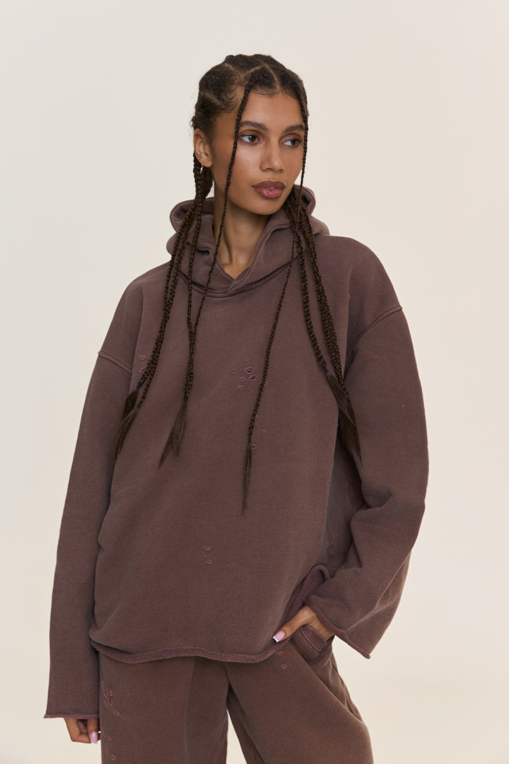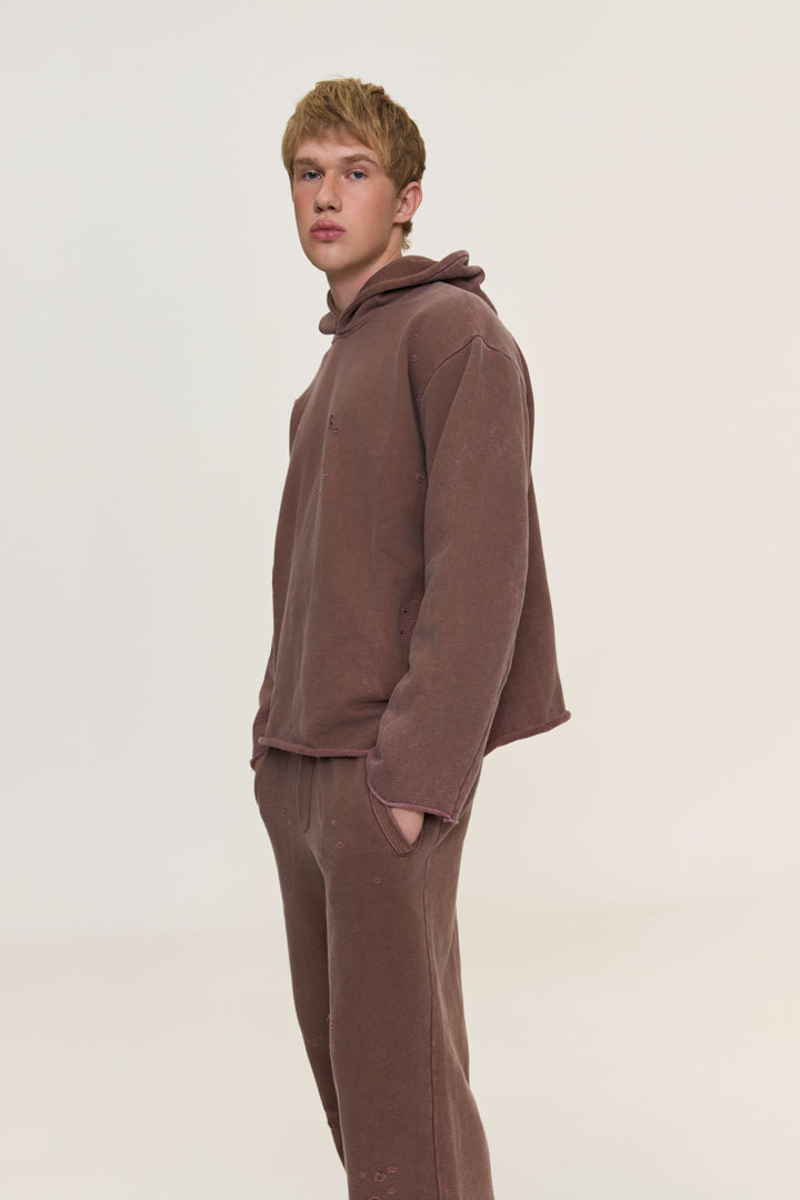 This direct-cut hoodie features long sleeves with raw edges and includes design elements such as scuffs and tears. Made from 100% thick cotton, the fabric has undergone a special treatment to achieve a boiled effect. It is highly resistant to sagging and stretching, ensuring durability and comfort for everyday wear.