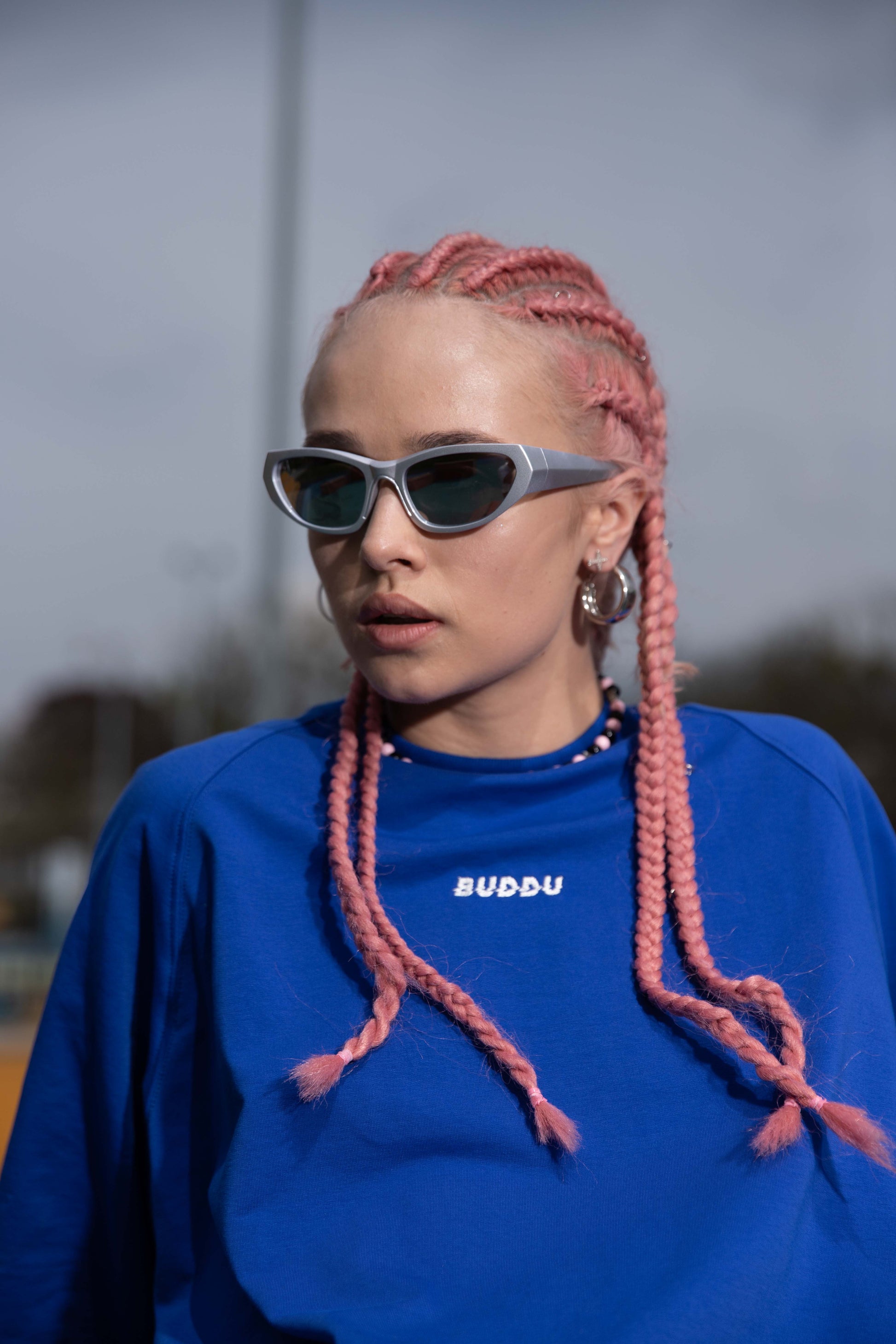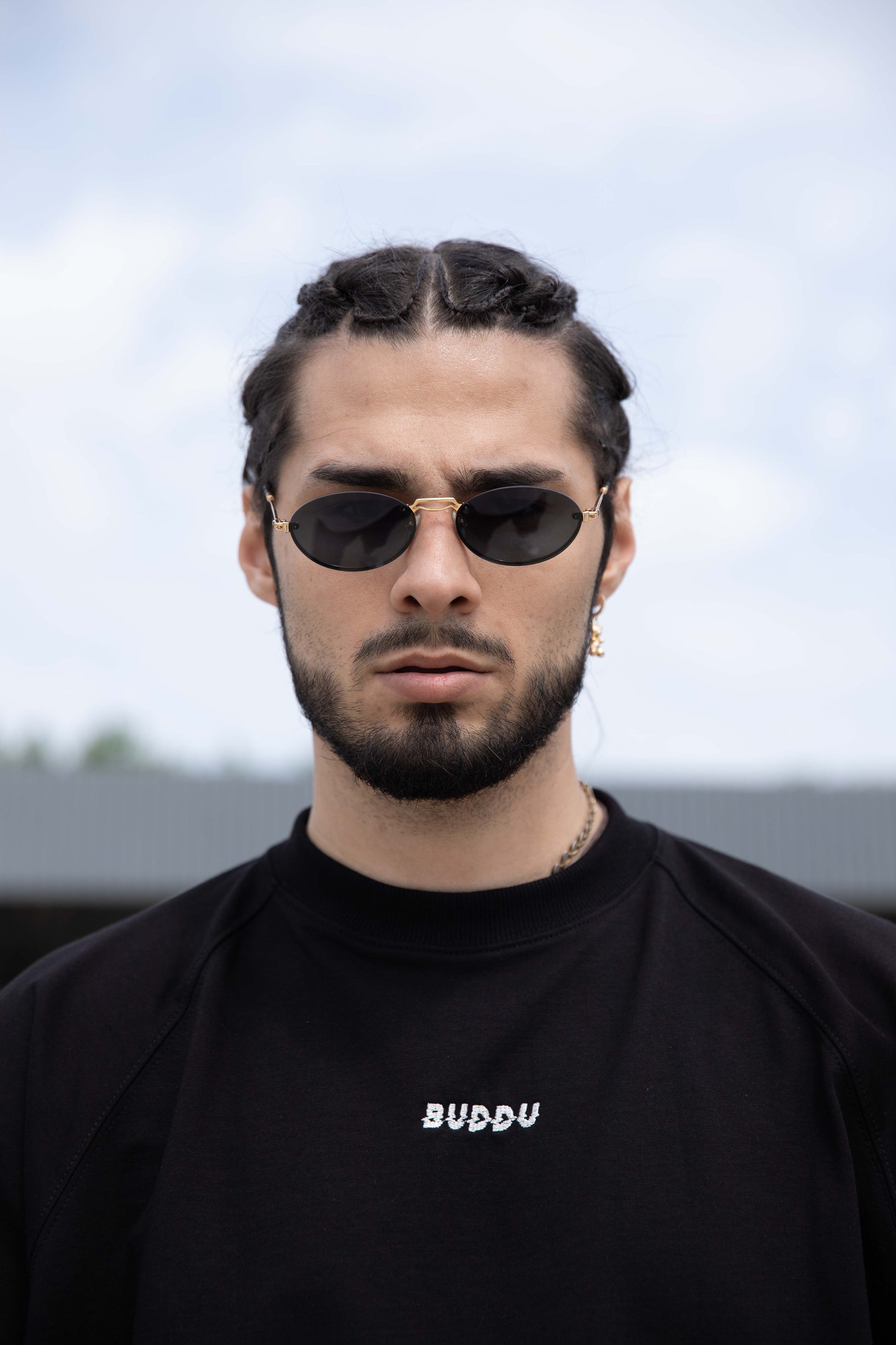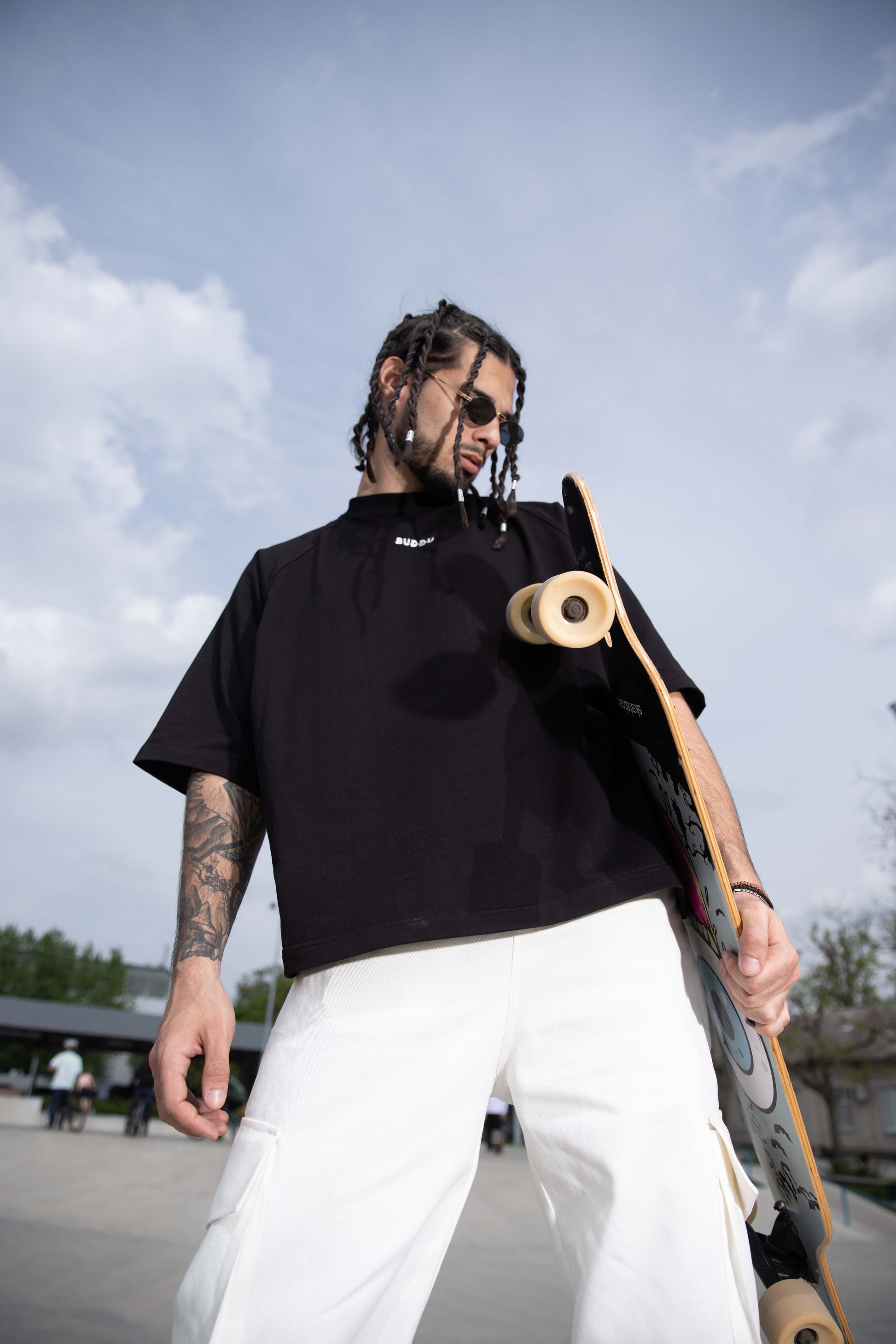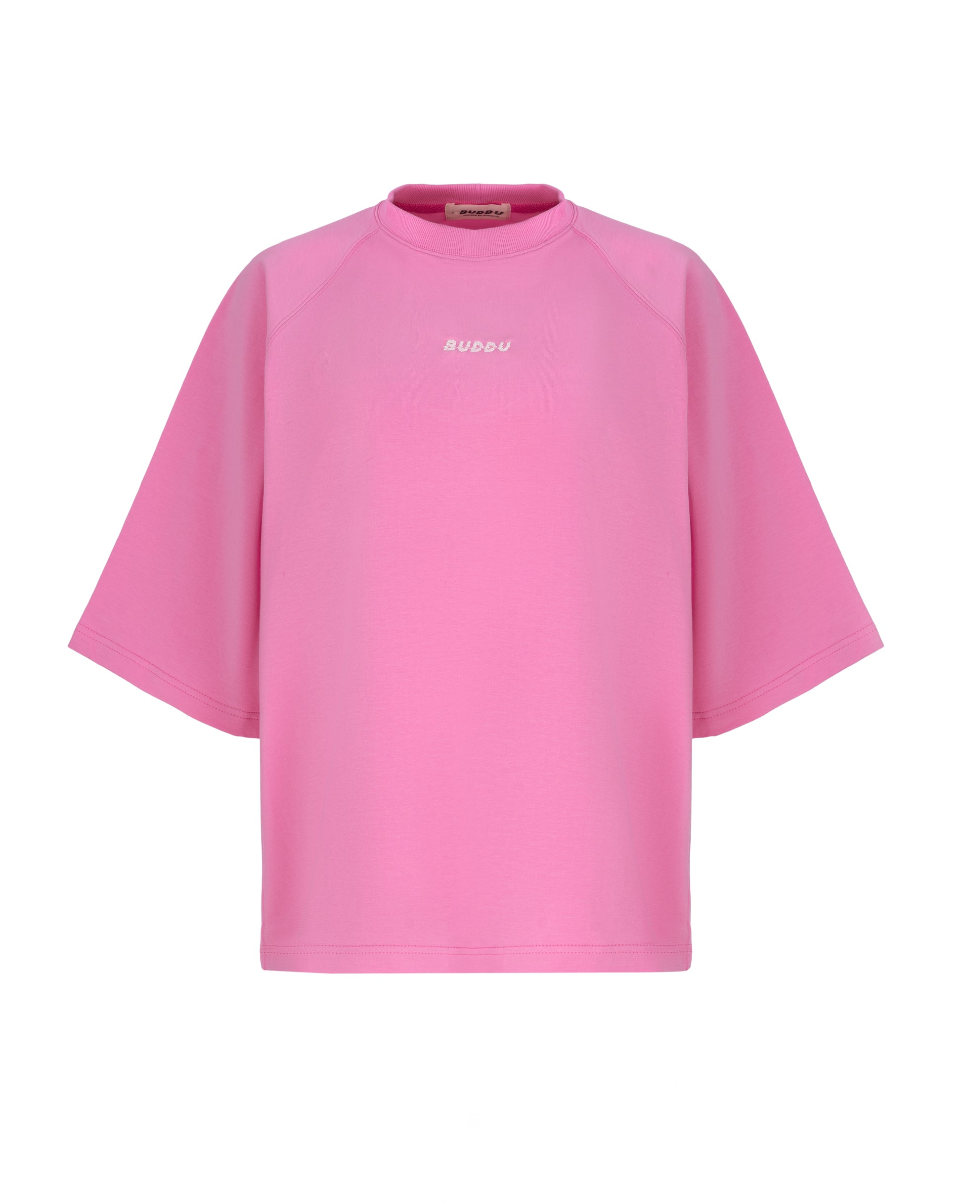 Free-cut T-shirt with lowered shoulders and a logo on the chest.