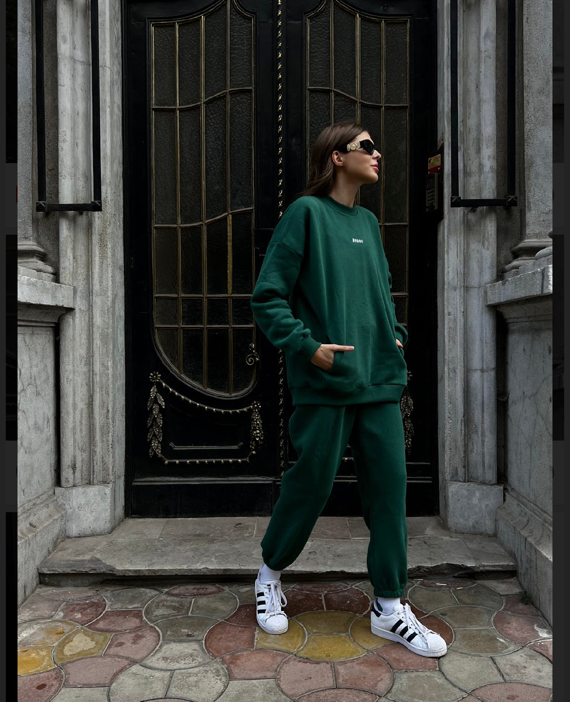 Elongated sweatshirt with pockets on the sides and joggers with pockets.