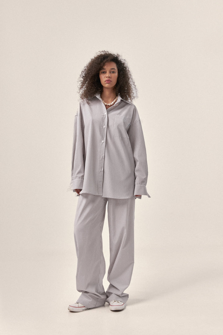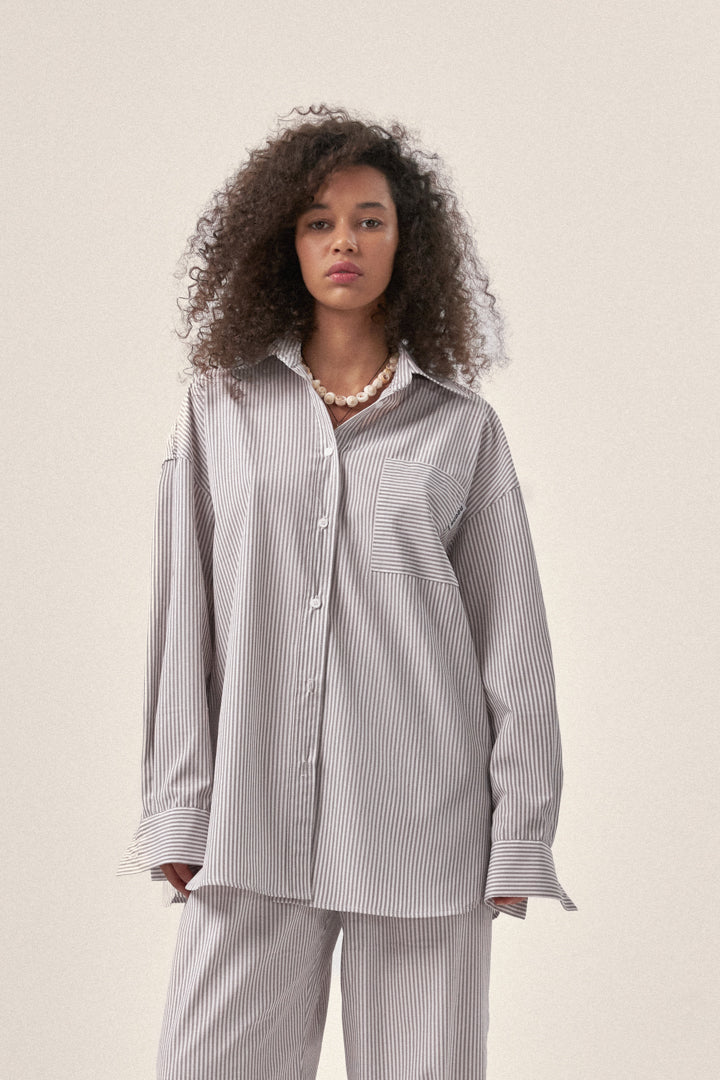A gray oversized shirt is a versatile everyday piece that pairs well with both sporty and casual outfits. It features a pocket on the left side for added functionality. The loose silhouette ensures comfort and ease, making this shirt an ideal choice for various occasions, from casual walks to informal meetings.