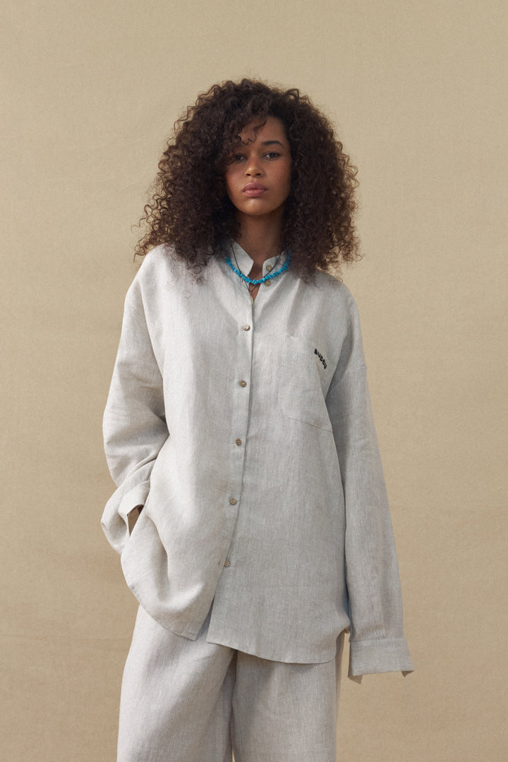 The oversized button-down shirt features a short stand-up collar and is characterized by its minimalist design and thoughtful cut. Its simple yet stylish silhouette makes it versatile for various outfits. The shirt adapts easily to any body type, providing comfort throughout the day, while the stand-up collar adds a bold accent. It is suitable for both business meetings and casual wear.