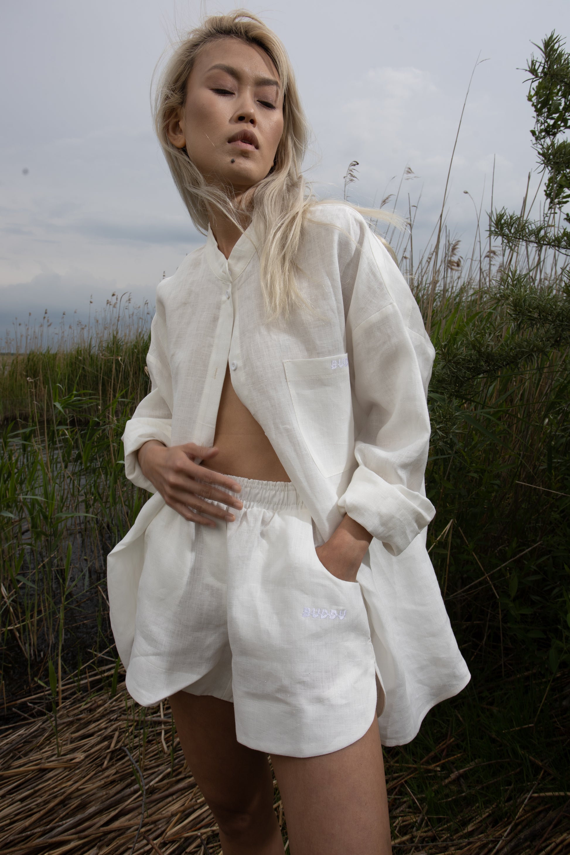 Shorts made of 100% linen in a loose cut with an original shaped bottom. They have a medium fit, which ensures comfort in wearing and are ideal for a summer wardrobe. The front of the shorts is decorated with embroidery with a logo. The natural material guarantees comfort and breathability, making these shorts a great choice for hot days.
