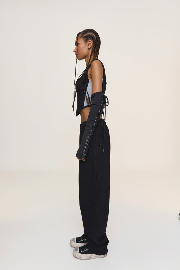 This fitted corset features inserted cups that support the chest and accentuate the silhouette. The sides have gray inserts that provide a stylish contrast. The back is secured with a tractor lock UKK, which matches the main fabric for a cohesive look. Made from thick, 100% high-density cotton, this corset ensures durability and comfort.