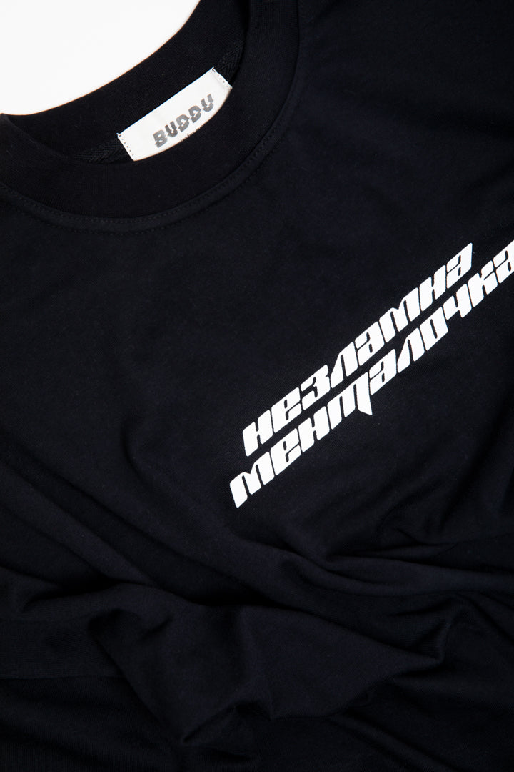Monochrome T-shirt featuring a contrasting print. Proceeds from the sale will support the psychological recovery of individuals suffering from post-traumatic stress disorder (PTSD), depression, panic attacks, and eating disorders (EDs) related to war.