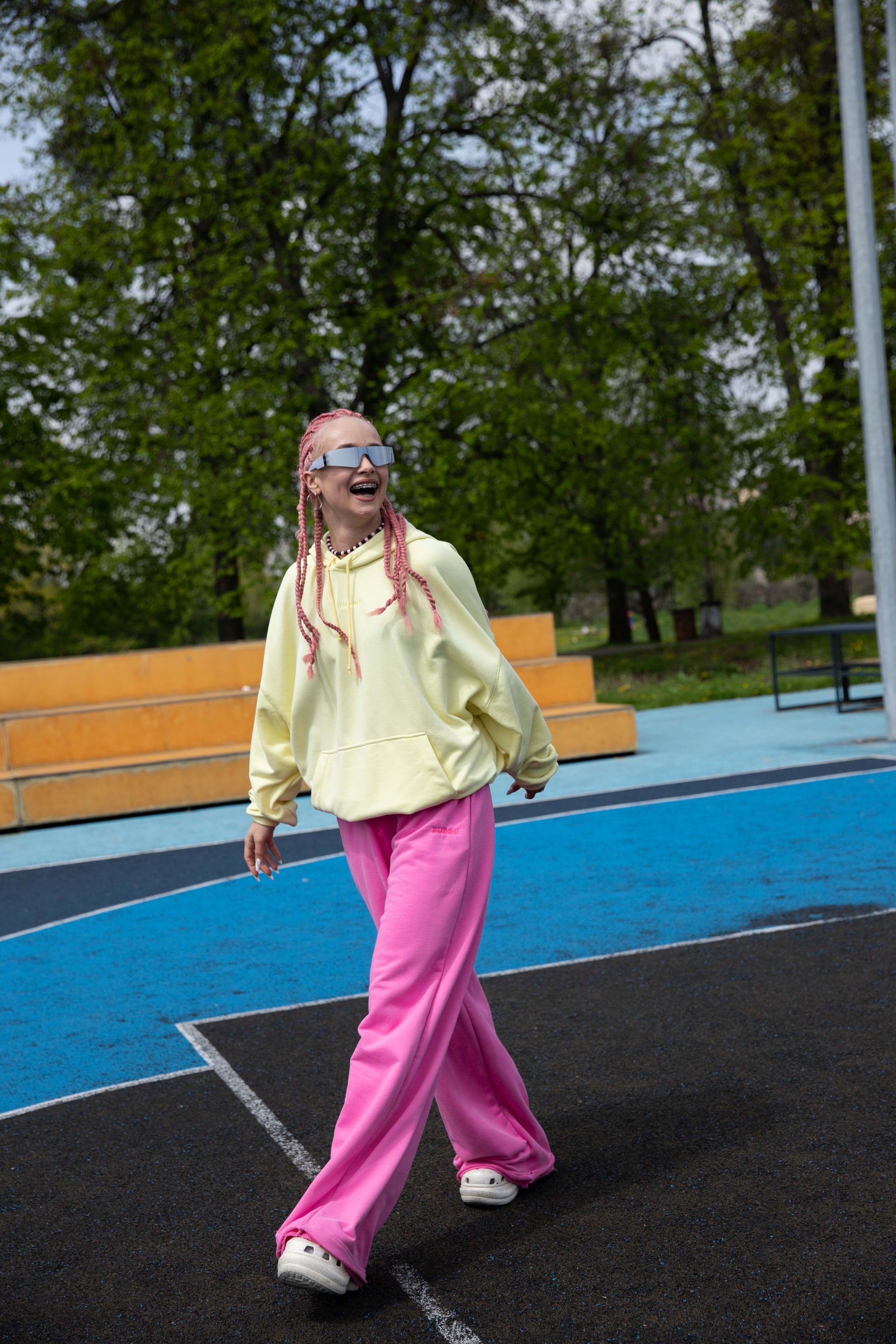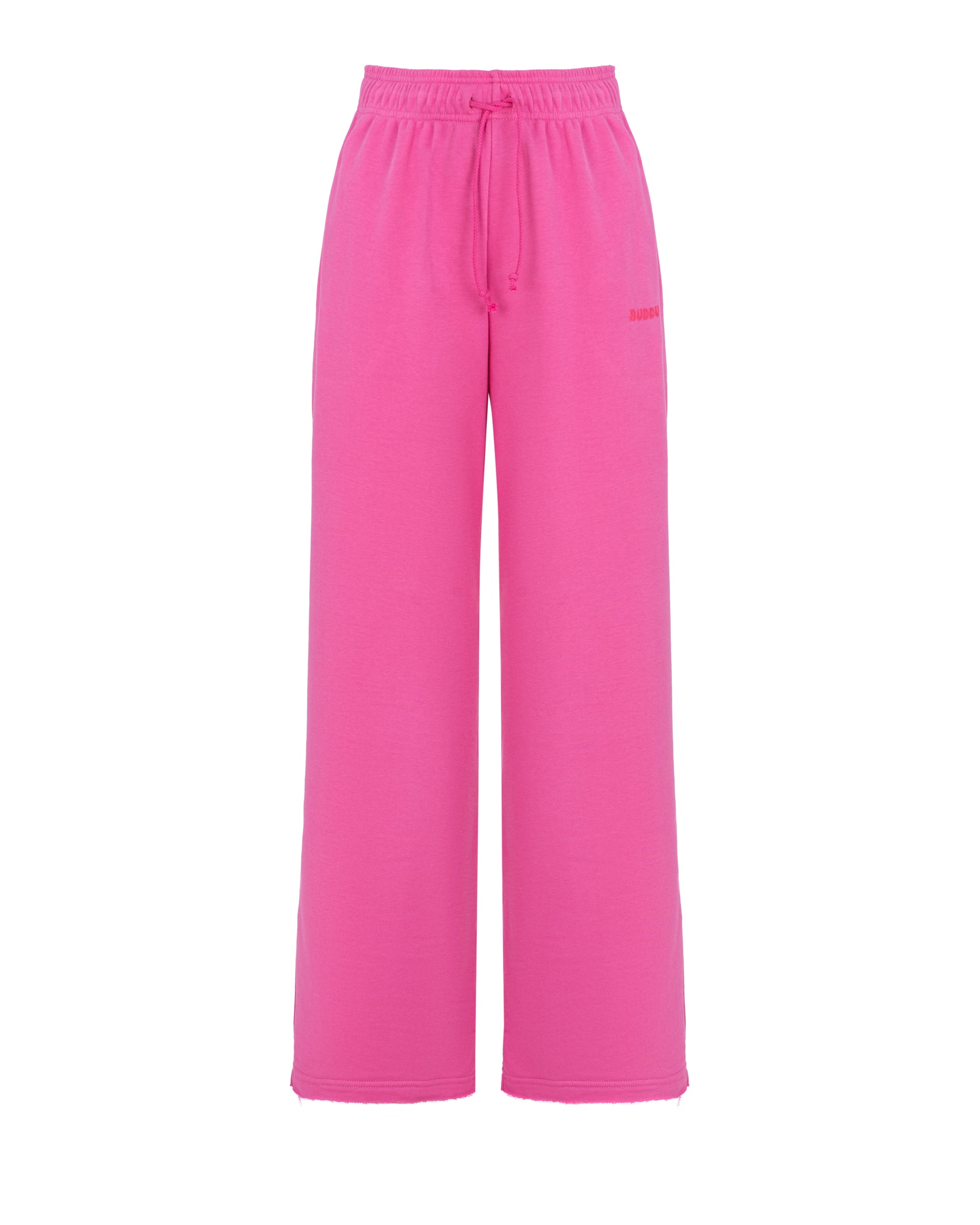 These Palazzo elastic pants feature a high waist and side pockets. An additional lace on the belt allows for adjustable waist sizing. There is a brand logo in color near the pocket.