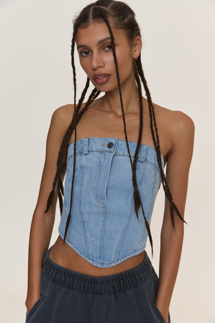 The top is crafted from 100% cotton and features a washed effect. Its fitted style beautifully highlights the figure. The adjustable ties at the back include a fastener, allowing you to customize the fit to your individual preferences. This versatile top complements a variety of styles, making it an essential piece for creating both casual and dressy outfits.