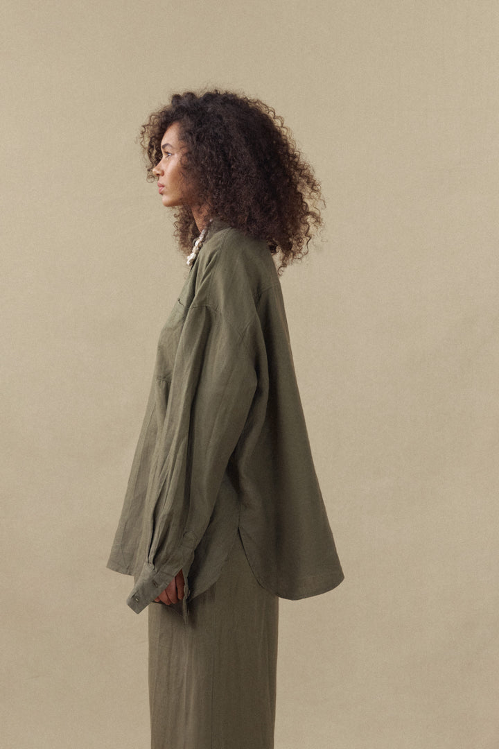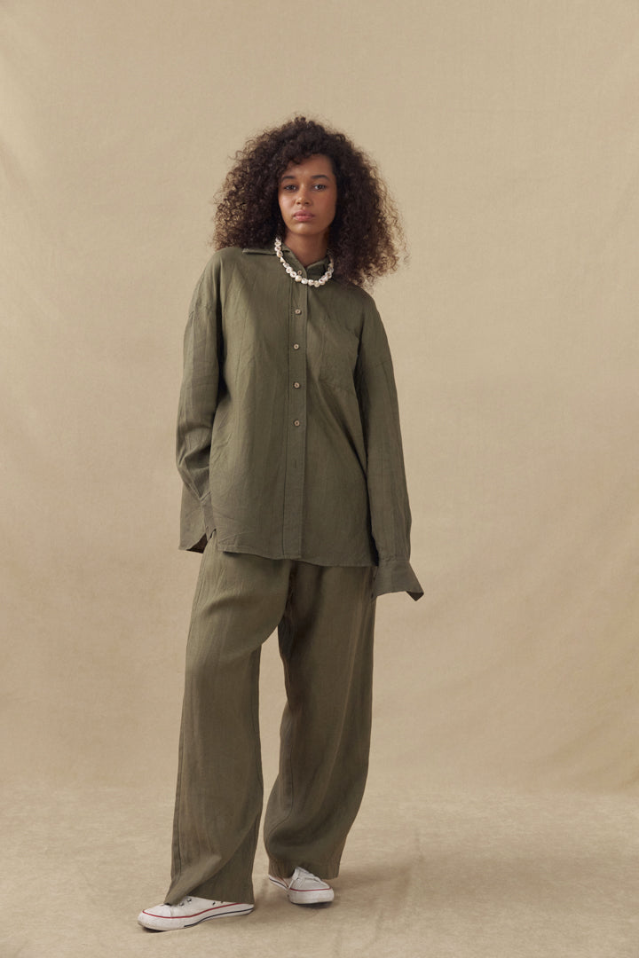 This oversized cut shirt is made of 100% French linen. French linen is renowned for its breathability, making this shirt a perfect choice for hot summer days. The loose fit adds comfort and allows for easy pairing with different wardrobe items. Thanks to its natural properties, the fabric feels soft against the skin, quickly absorbs moisture, and evaporates it, ensuring you feel fresh even in the warmest weather.