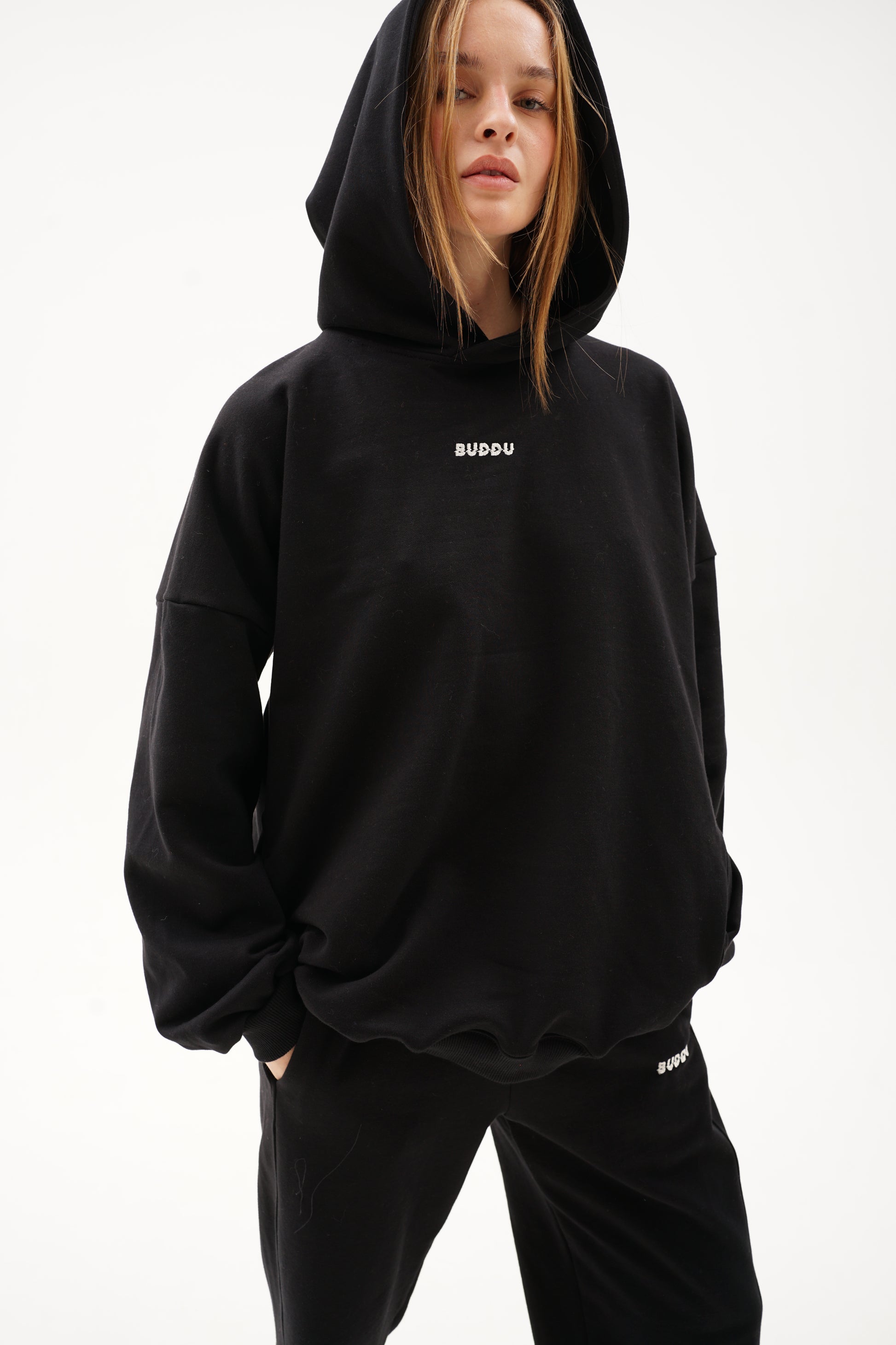 Elongated hoodie with pockets on the sides and joggers with pockets.