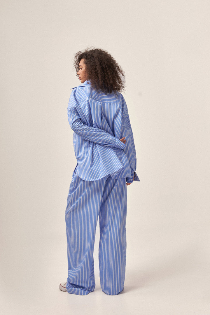 Striped pajama-style trousers made from 100% natural cotton are a comfortable choice for both lounging at home and casual outings. With their loose fit and elastic waistband, these pants provide great ease of movement. The classic striped design makes them easy to mix and match with various pieces in your wardrobe, allowing you to create stylish and relaxed outfits.