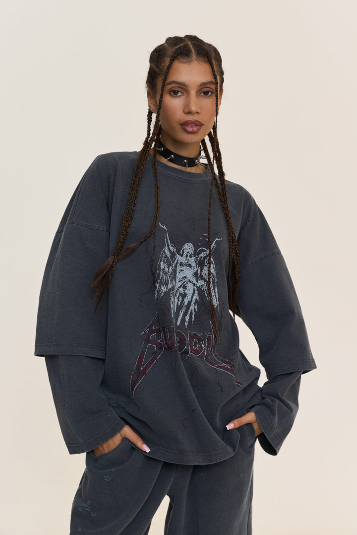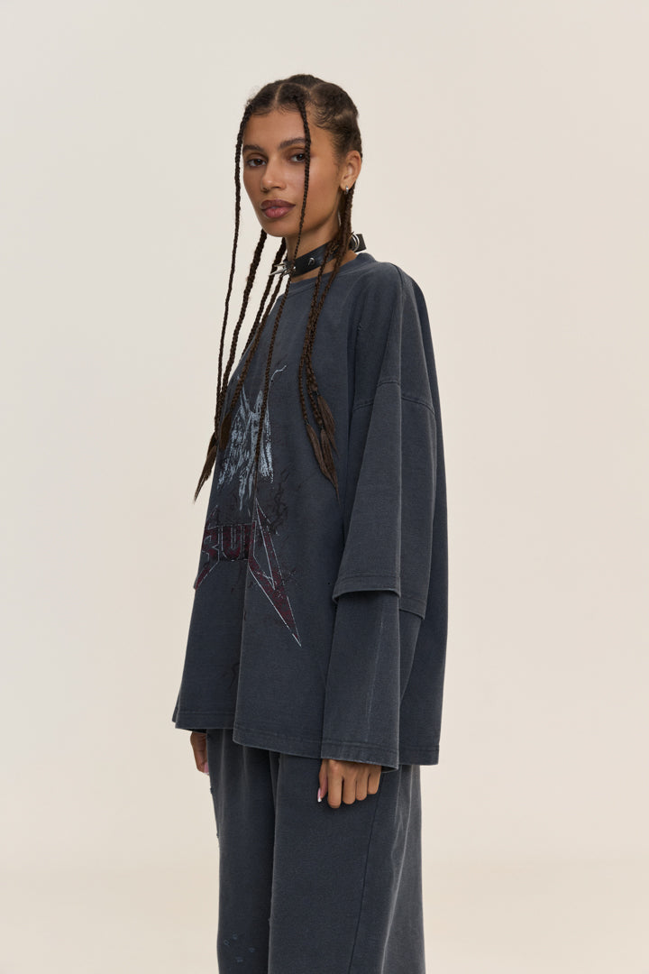 Oversized longsleeve shirt made from 100% cotton. It features a round neckline and double sleeves that create a multi-layered effect, complemented by a contrasting print on the front. A special treatment of the material gives it the appearance of boiled fabric.