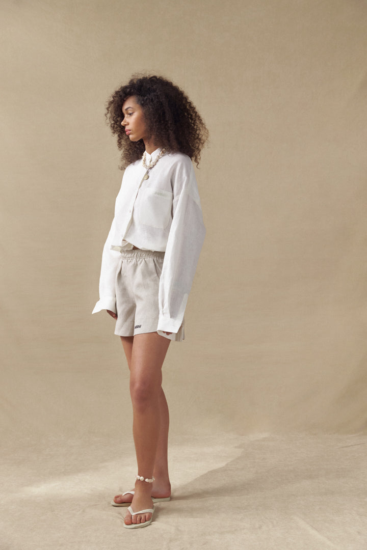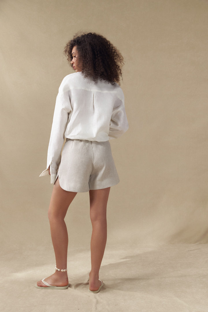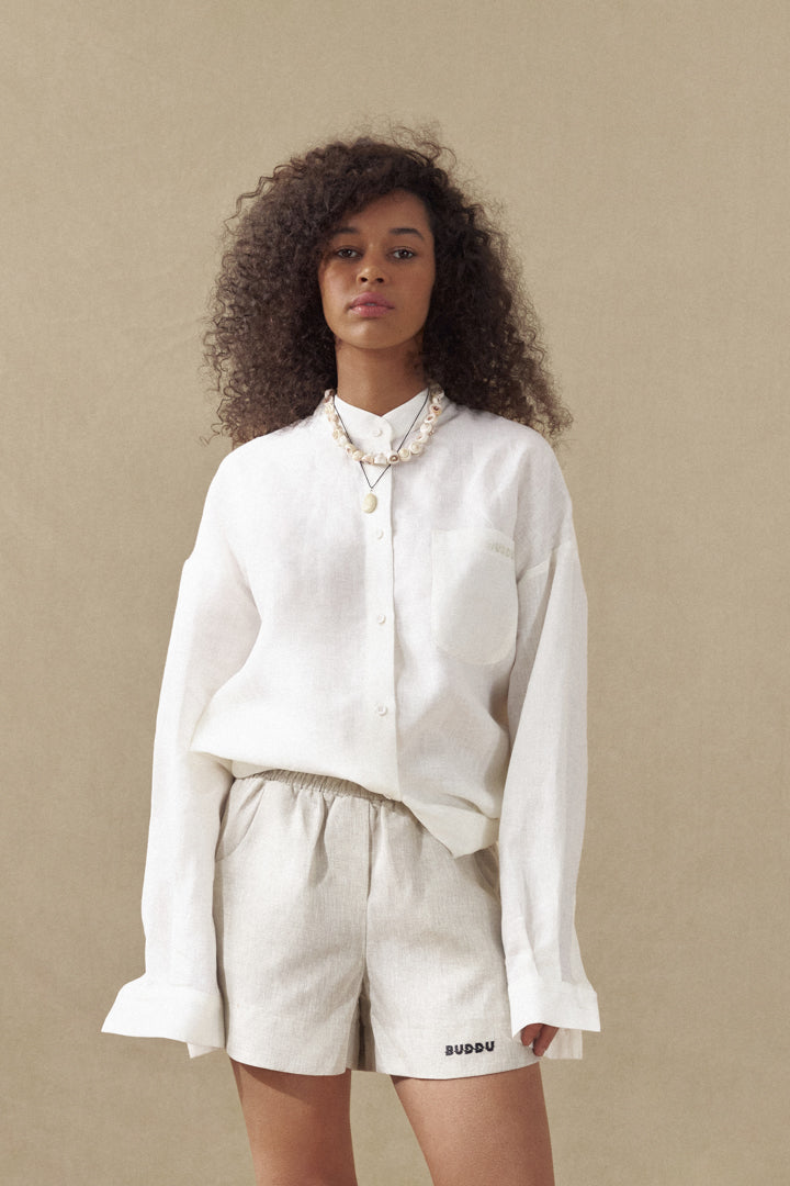 The oversized button-down shirt features a short stand-up collar and is characterized by its minimalist design and thoughtful cut. Its simple yet stylish silhouette makes it versatile for various outfits. The shirt adapts easily to any body type, providing comfort throughout the day, while the stand-up collar adds a bold accent. It is suitable for both business meetings and casual wear.