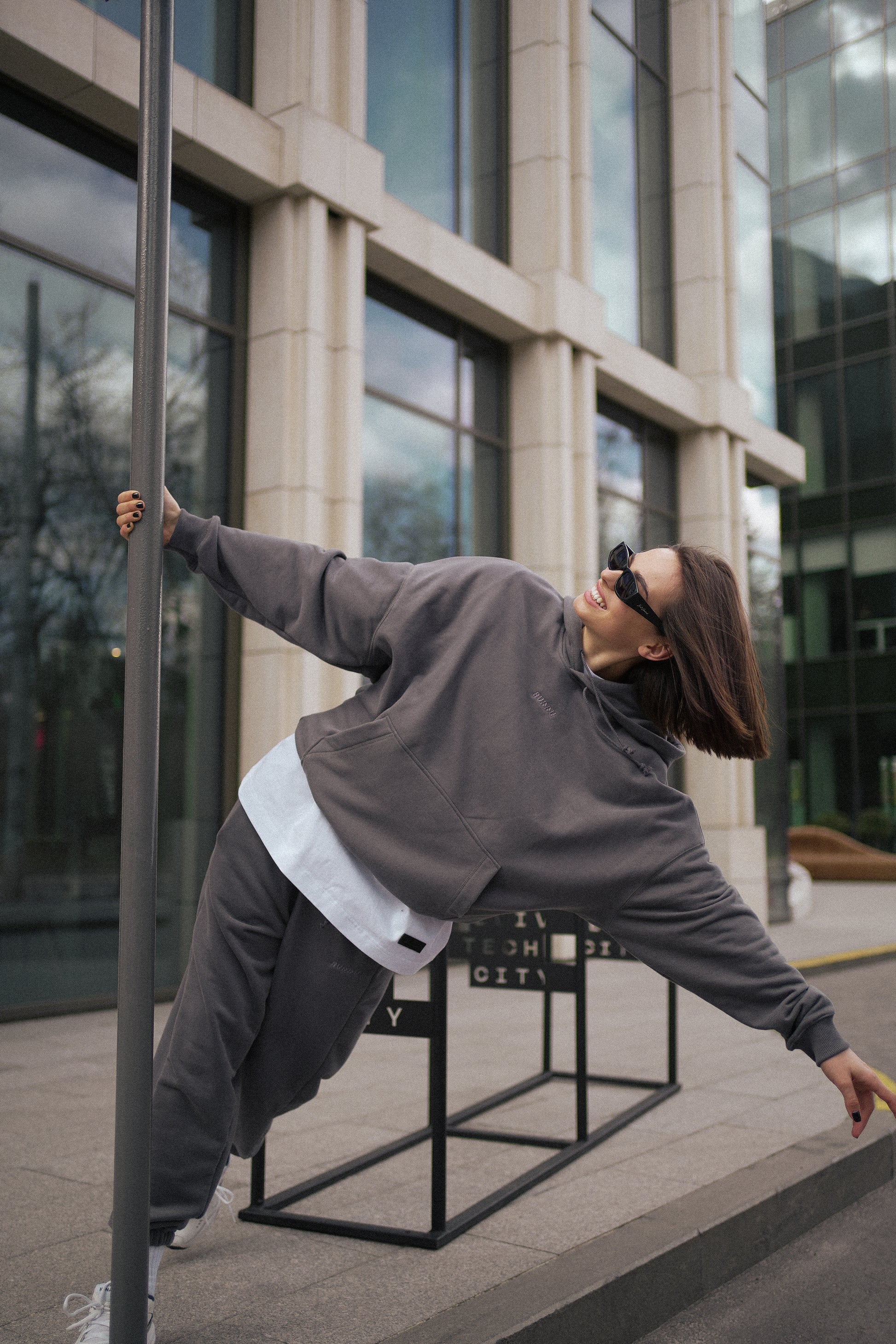 The URBAN sports suit includes a hoodie featuring a relaxed design with a hood and dropped shoulders. In the center of the chest, there is an embroidered logo that adds emphasis. The hoodie is designed with pockets for added convenience, and it comes with adjustable laces on the hood and waistband for a secure fit. The palazzo trousers have an elastic waistband and side pockets, making them both stylish and practical.