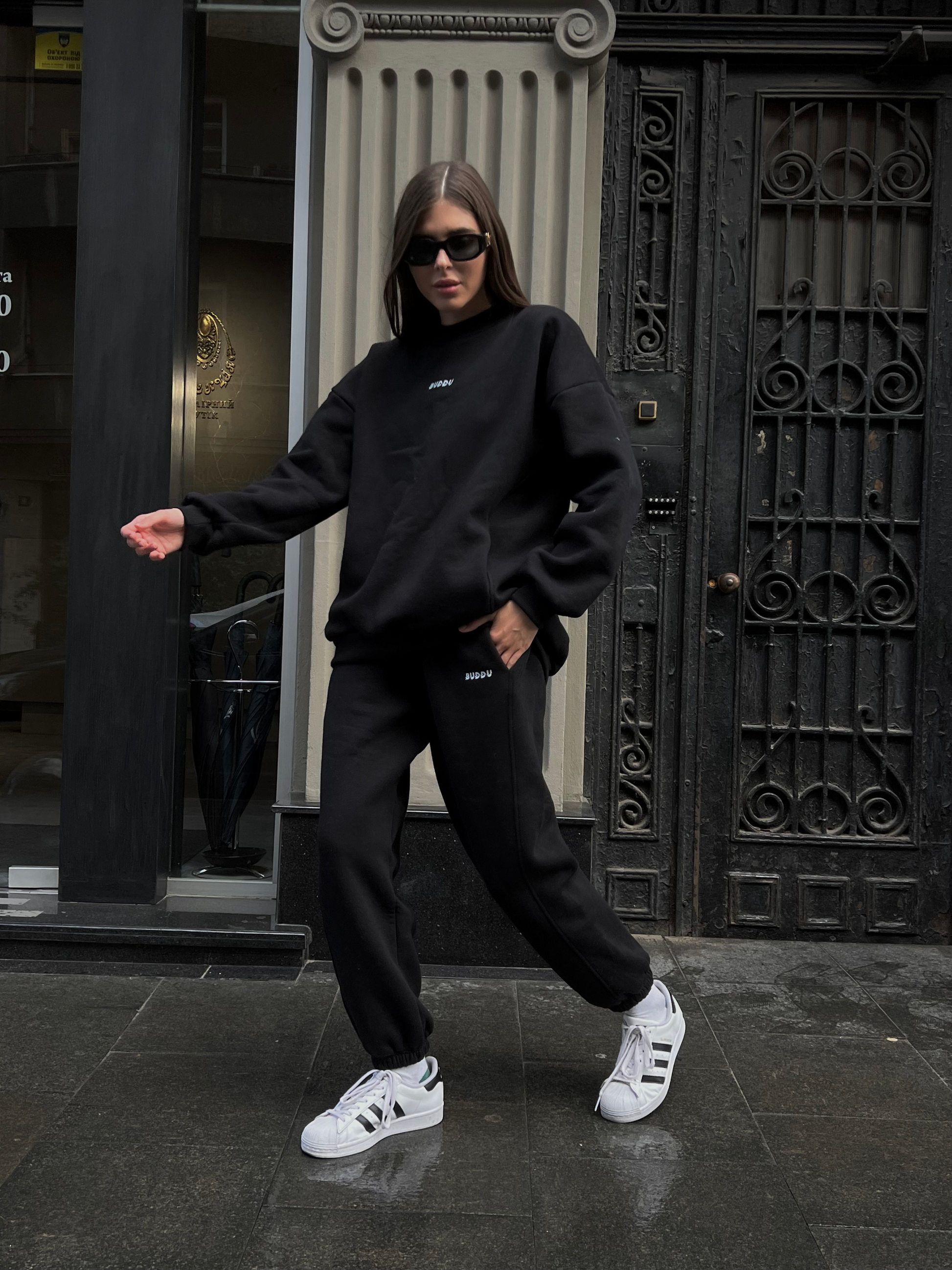 Elongated sweatshirt with pockets on the sides and joggers with pockets.