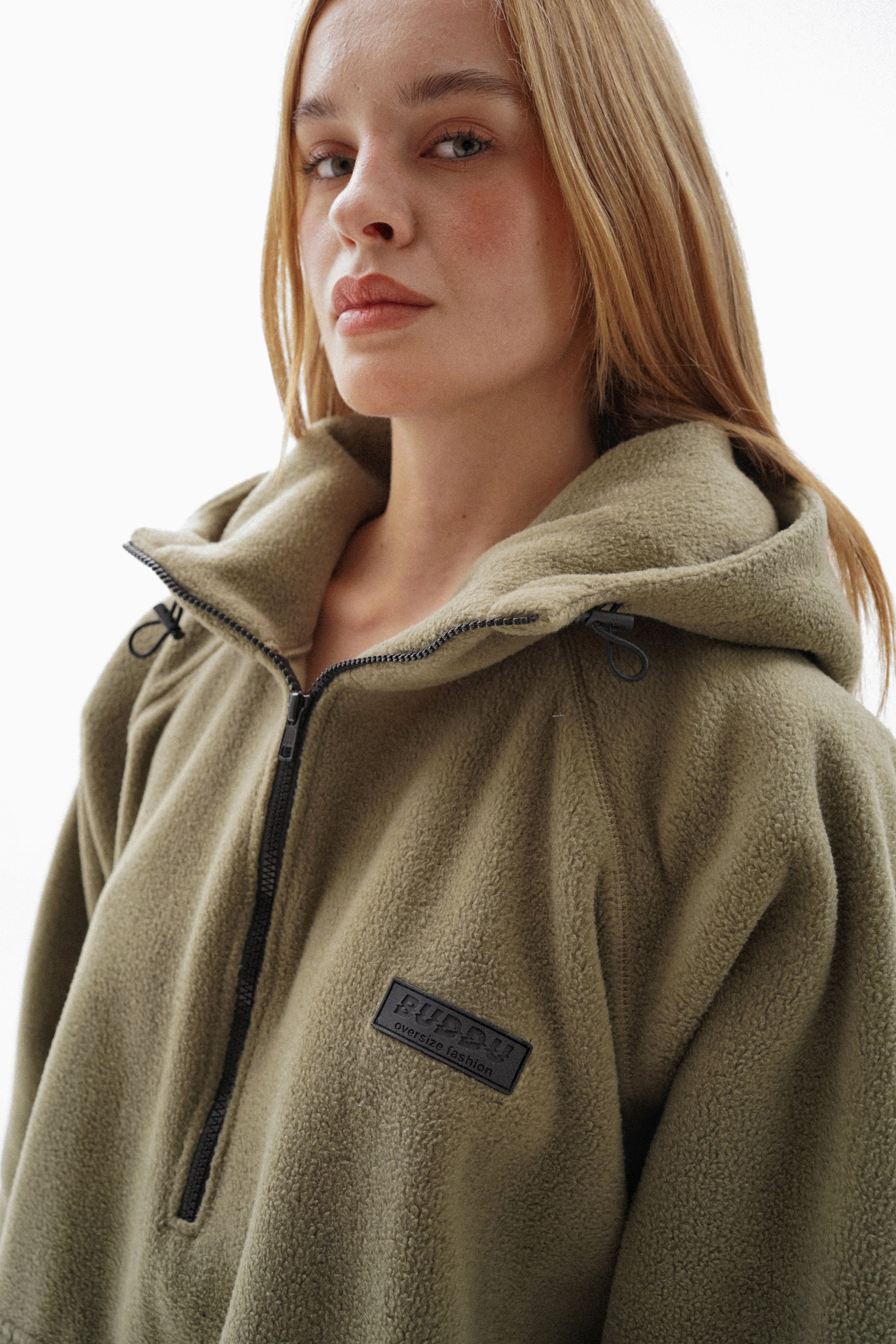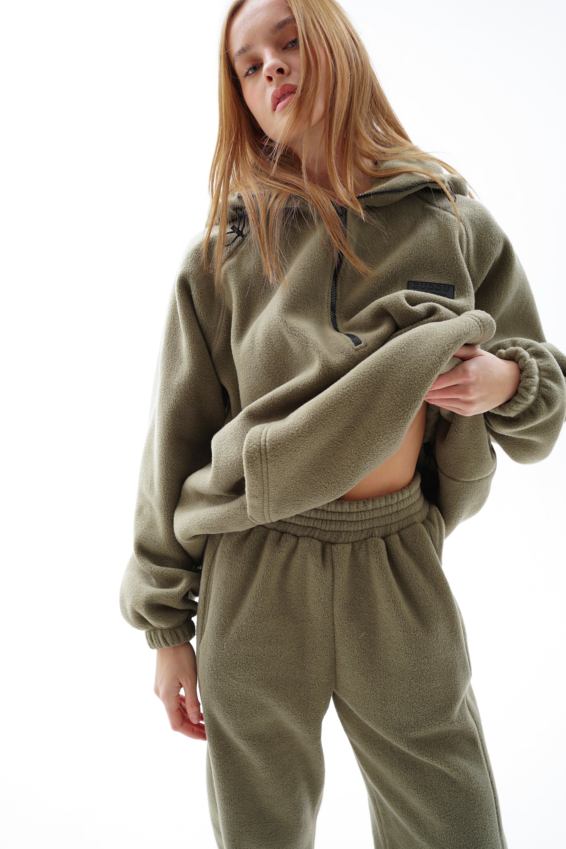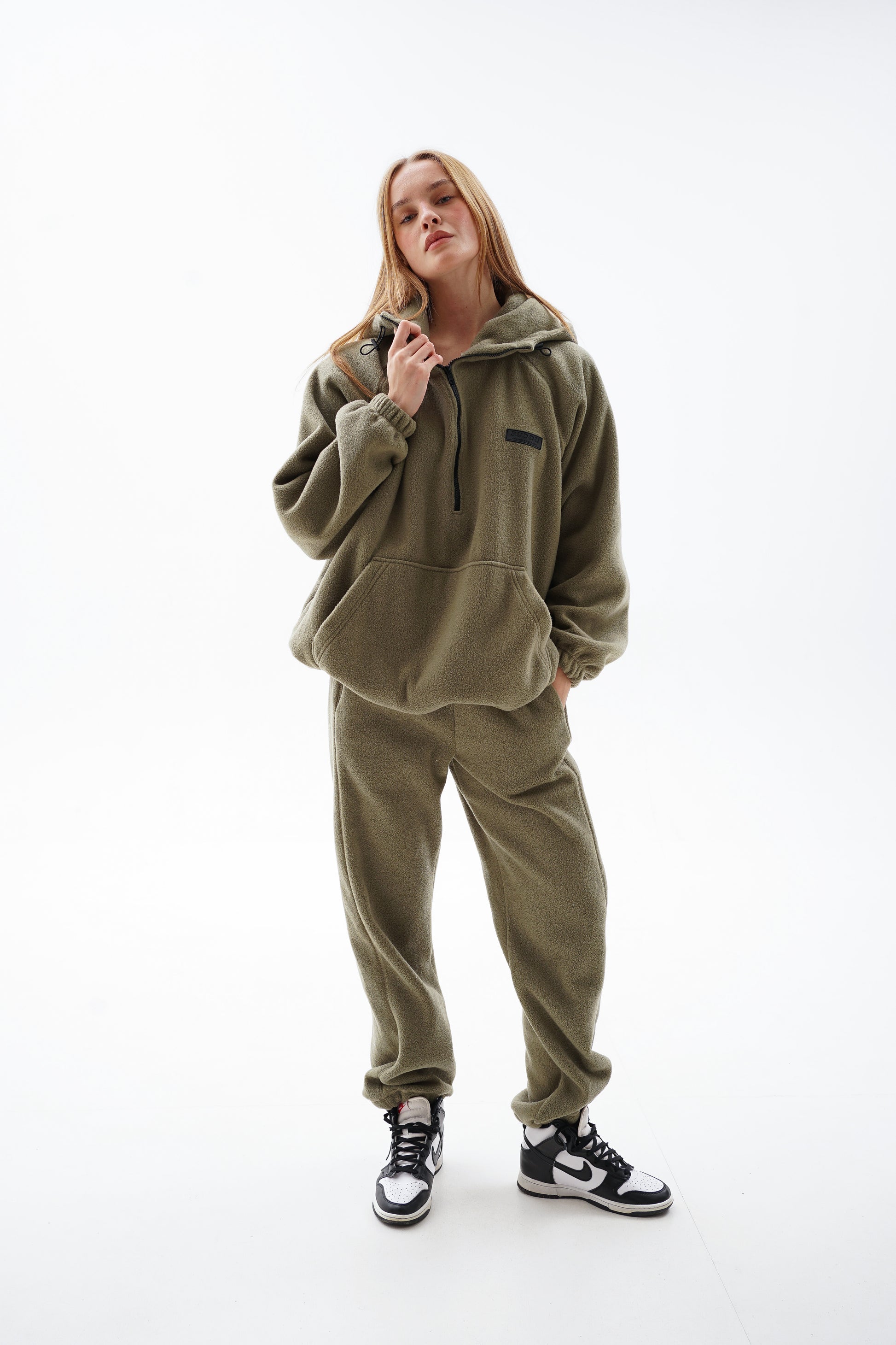 Zip hoodie featuring a 3/4 zipper under the neck, a hood, side pockets, and ties at the bottom. Joggers with an elastic waistband, pockets, and fitted cuffs at the bottom.