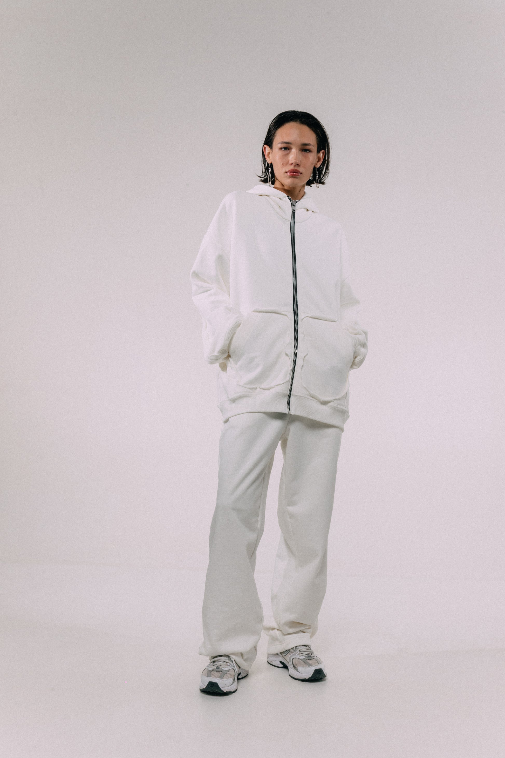 The ESSENTIAL sports suit strikes the perfect balance between functionality and style. The hoodie features spacious pockets for added practicality, while the embroidered logo on the hood, crafted in a matching tone, highlights attention to detail and provides a bold accent. The zipper design allows for easy wear and removal, making it suitable for any weather. This model combines convenience and aesthetics, ensuring comfort throughout the day, no matter the activity.