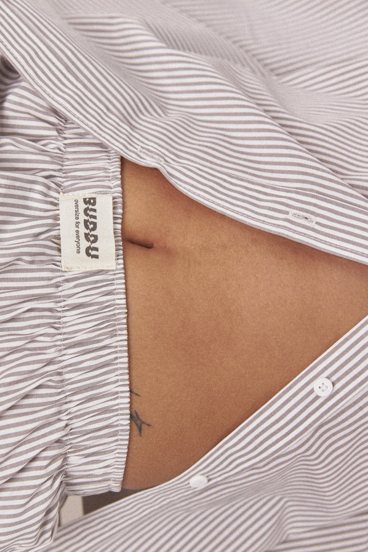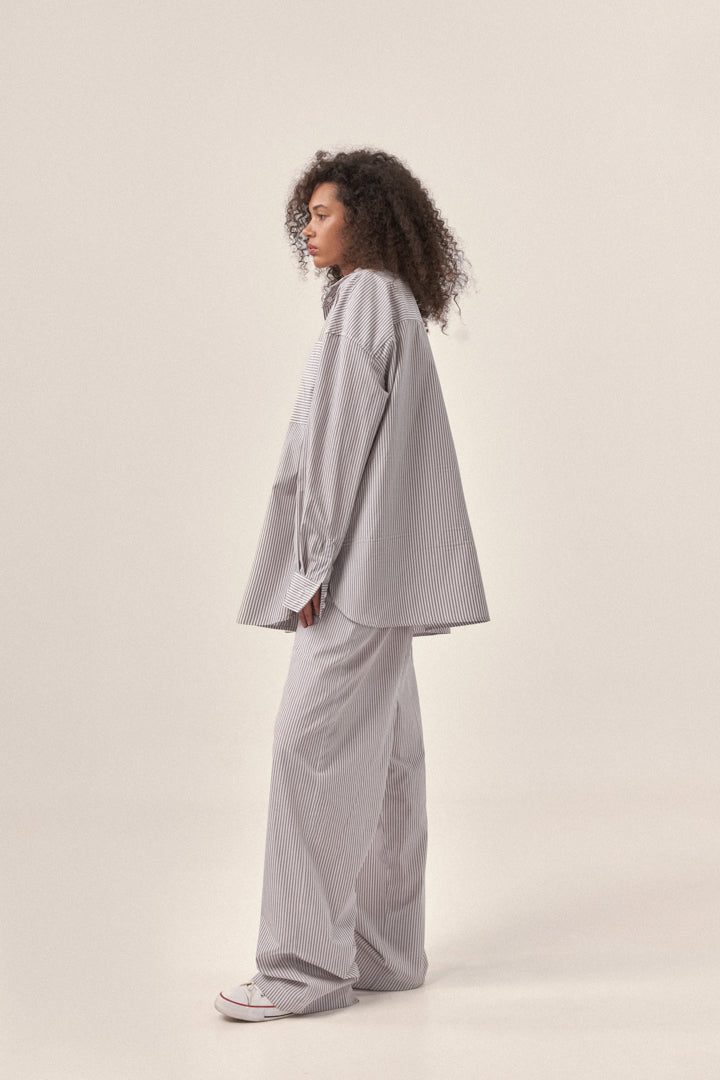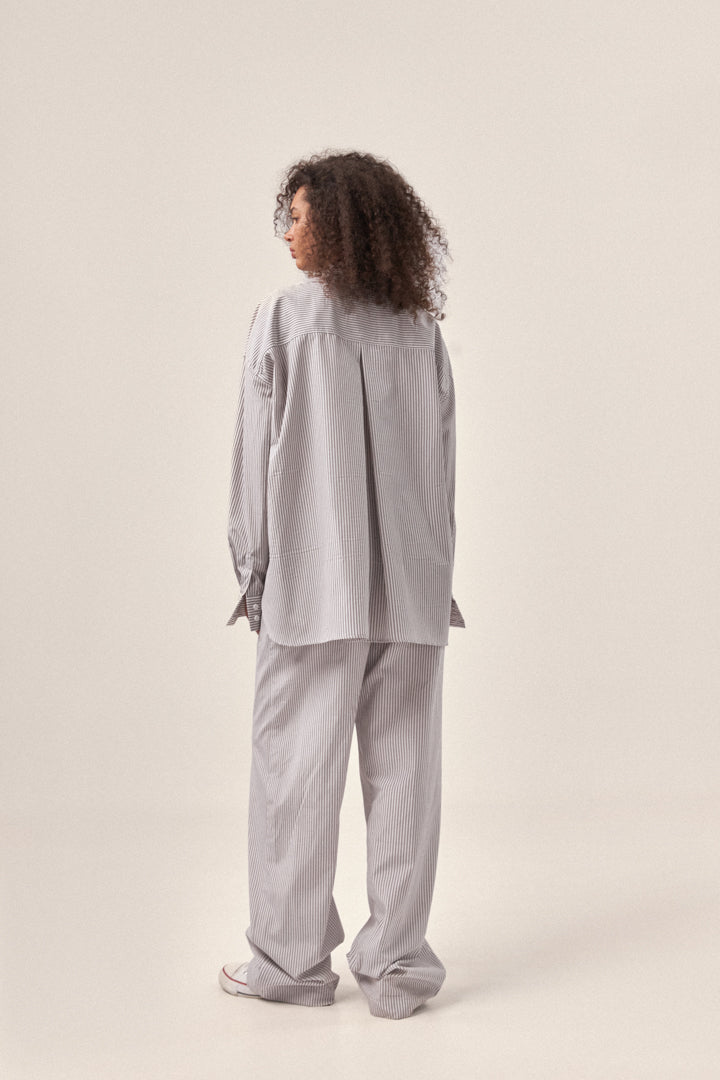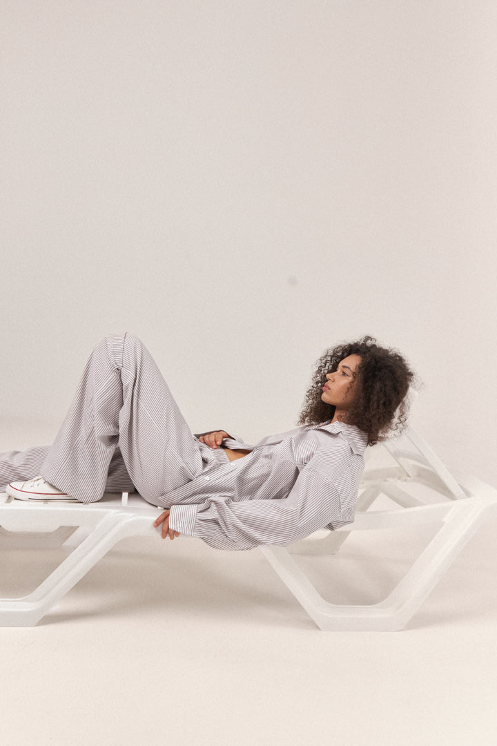 Striped pajama-style trousers made from 100% natural cotton offer a comfortable and relaxed fit. With their loose cut and elastic waistband, these pants are perfect for lounging at home or for casual walks. The classic striped design allows for easy pairing with different wardrobe pieces, helping you create stylish and effortless looks.