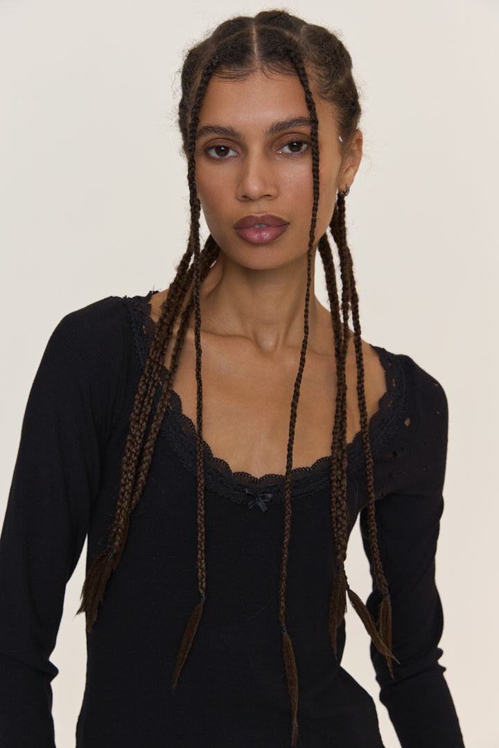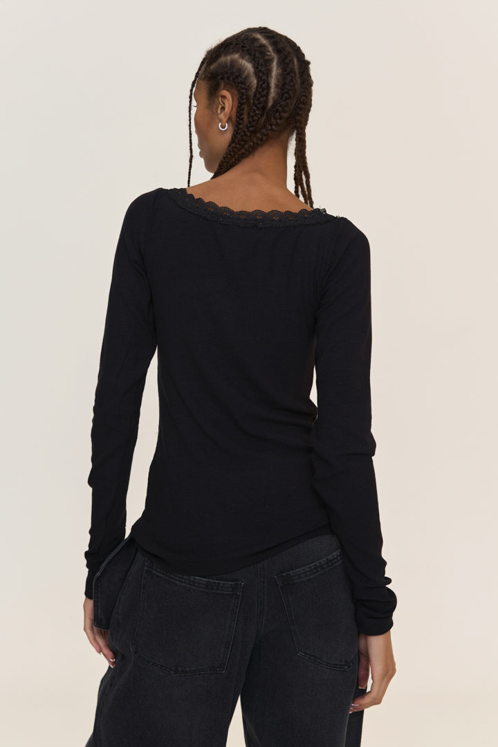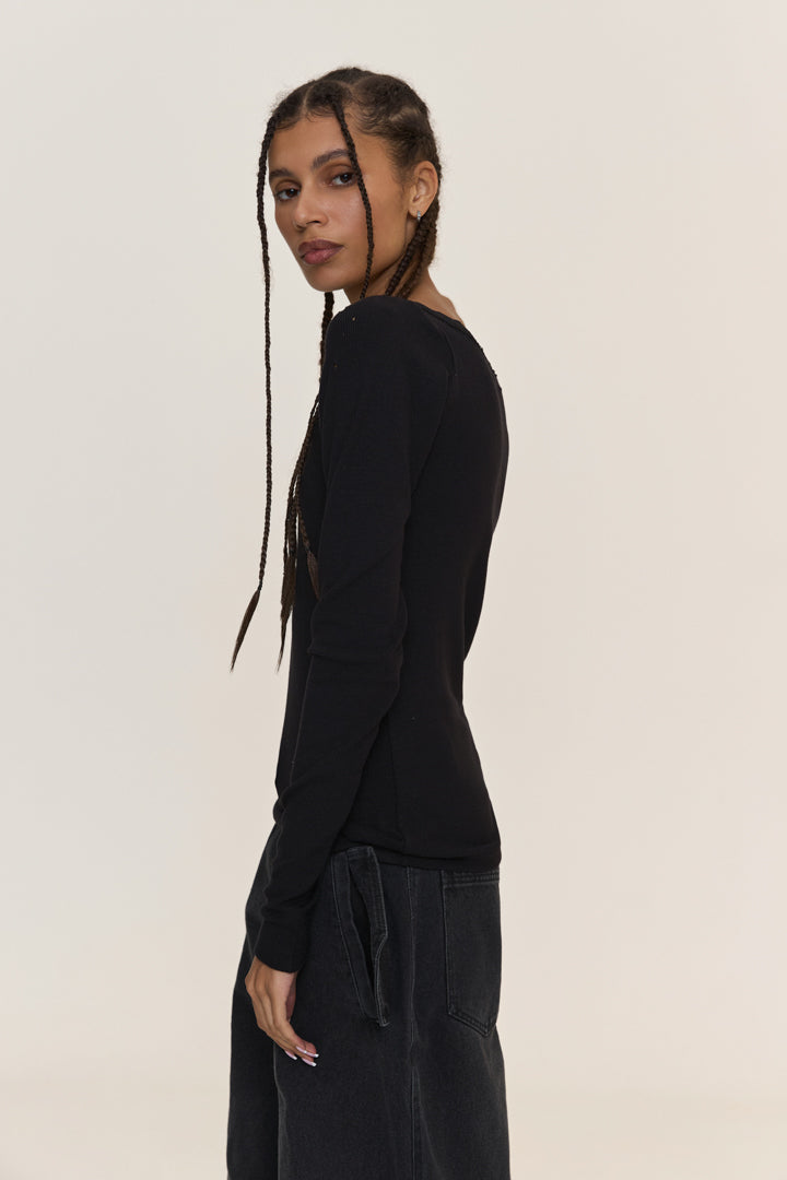 This longsleeve top features a V-neckline adorned with lace, enhancing its elegant design. The model includes long sleeves that have decorative torn elements at both the sleeves and neckline. Crafted from natural ribbed viscose knitwear, this longsleeve offers maximum comfort and a soft feel against the skin, thanks to the material's natural properties.