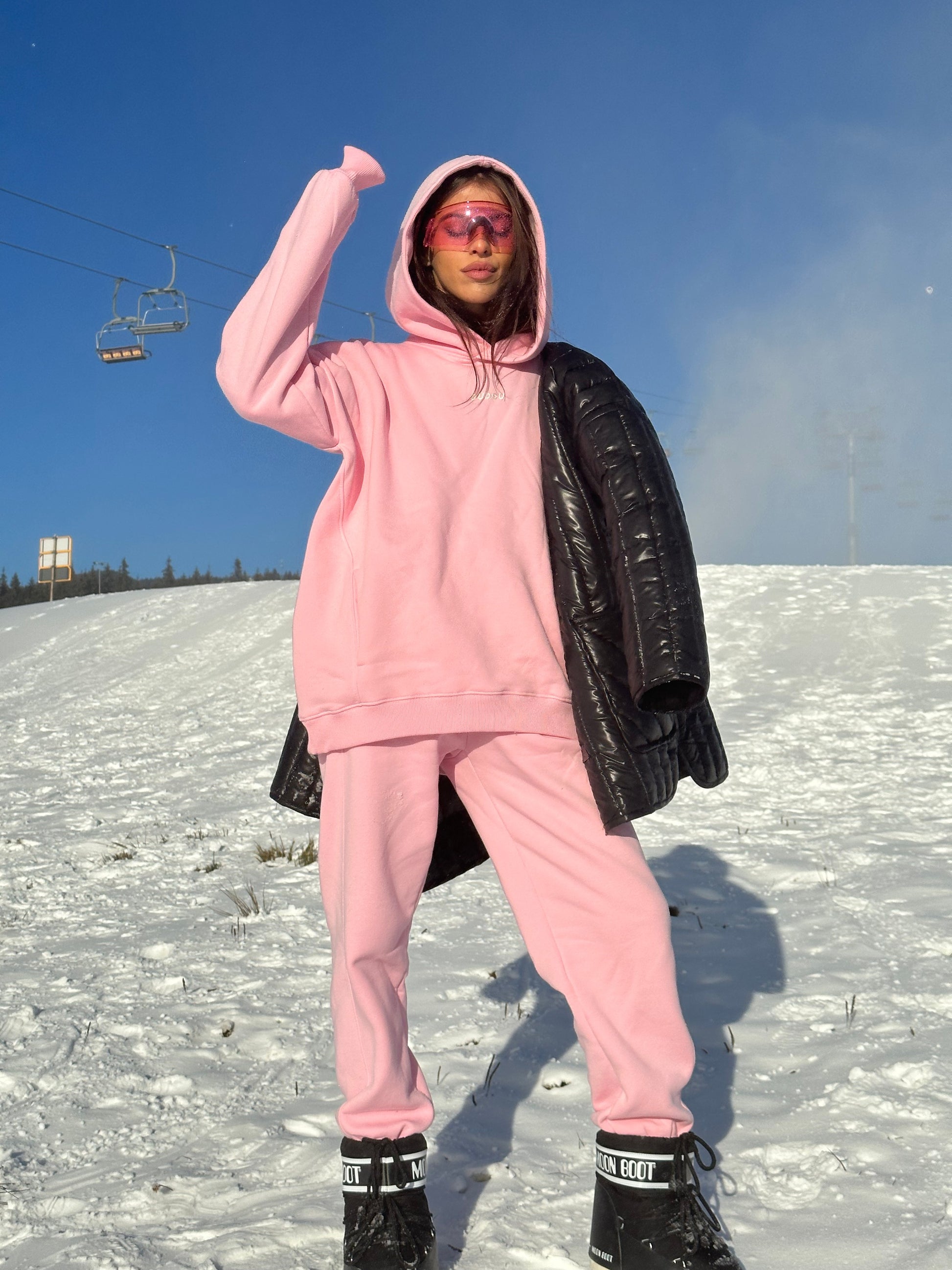 Elongated hoodie with pockets on the sides and joggers with pockets.