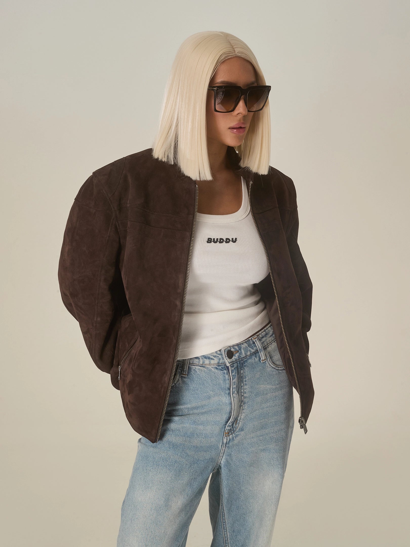 Discover our deep chocolate suede bomber jacket, crafted from genuine leather for a rich, tactile feel. Its minimalist cut features a hidden zipper and structured shoulders, blending timeless design with a contemporary streetwear vibe. The result: a perfect harmony of classic elegance and modern urban style.