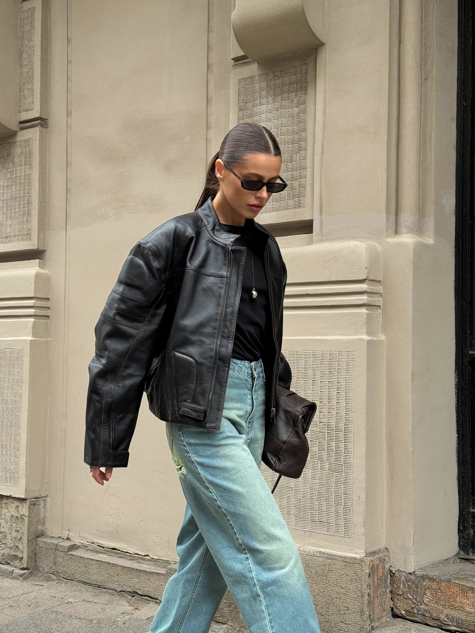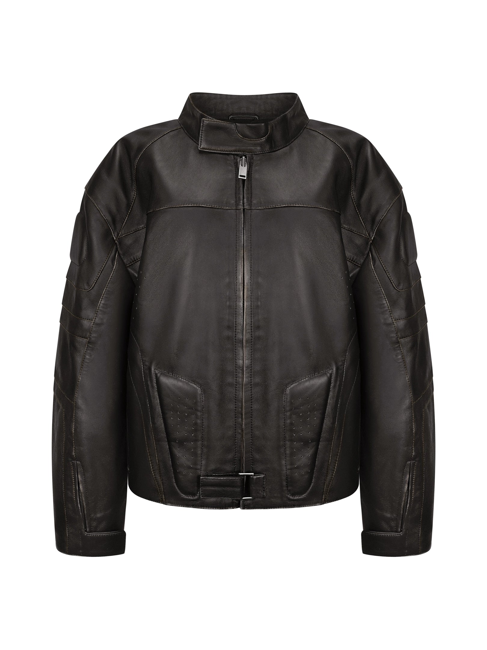 Об’ємна шкіряна куртка з мото-ДНК, виготовлена з м’якої натуральної шкіри ягняти. Силует із чіткими лініями та графічними вставками створює ефект захисту й впевненості. Посилені плечі, рельєфні шви та масивні деталі підкреслюють силу образу. Застібка на блискавку, регульований низ із пряжкою, функціональні кишені. Лаконічний чорний колір і тиснений логотип Buddu ззаду.